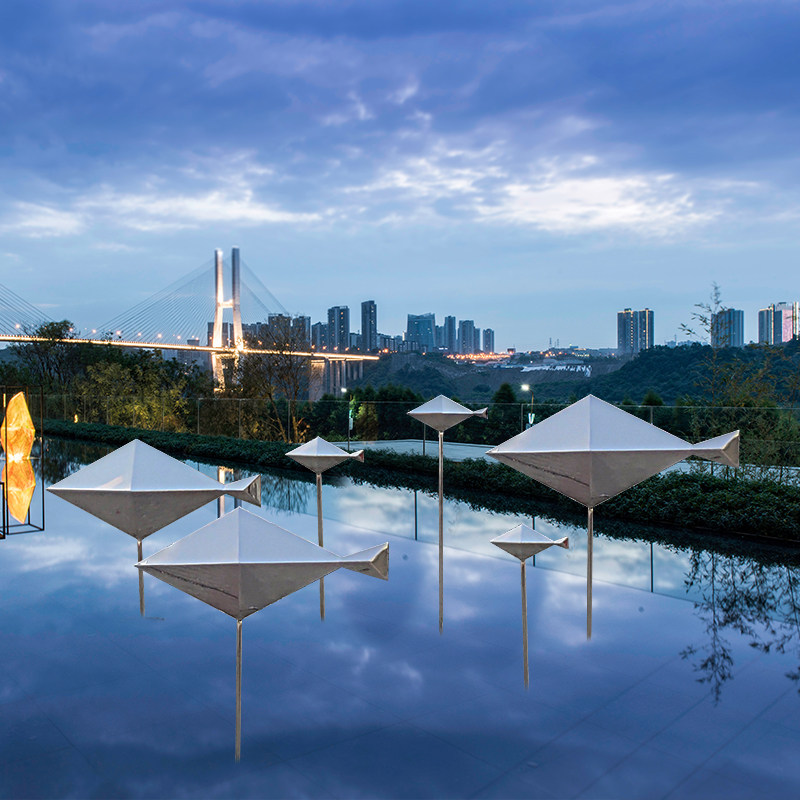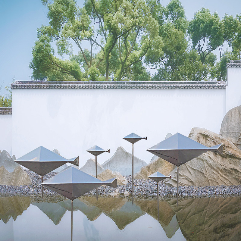 New Chinese Courtyard Landscape Outdoor Flowing Water Fish Pool Water System Building View Garden Stainless Steel Rhomboid Mirror Fish Decoration