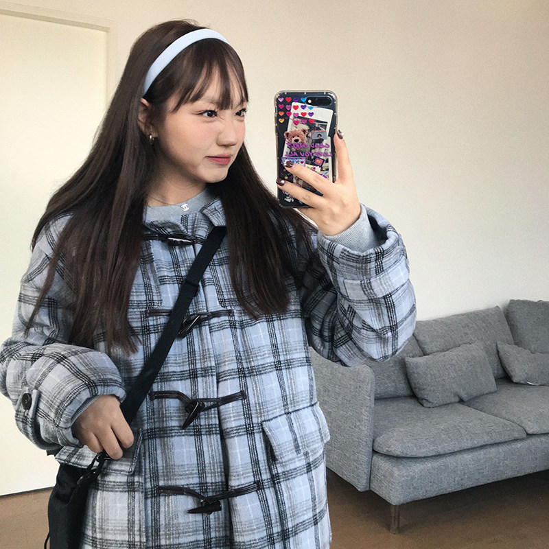 Wang girl's shop Horn button woolen coat 2022 autumn and winter new white plaid mid-length coat