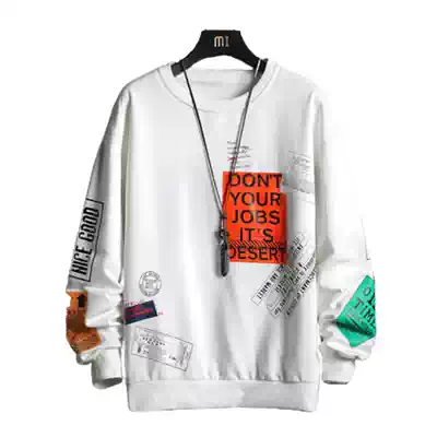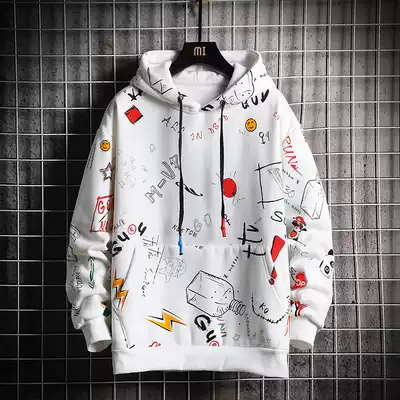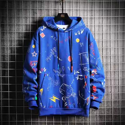 Tide brand autumn and winter trend round neck printed personality clothes male couples wild loose plus size long sleeve thin coat