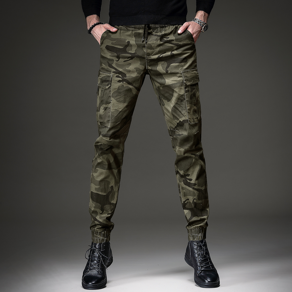 Expensive color summer fashion brand camouflage tooling casual pants men's slim small feet Korean version of the trend drawstring outdoor men's military pants