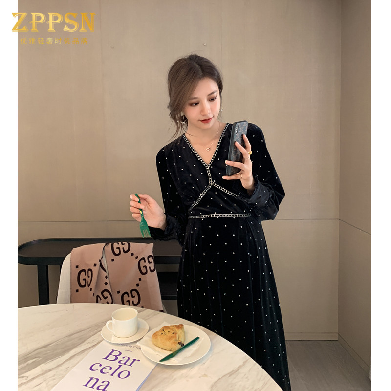 Italian ZPPSN special cabinet spring autumn new gestation woman with star temperament V collar slim velvet long sleeve foreign dress