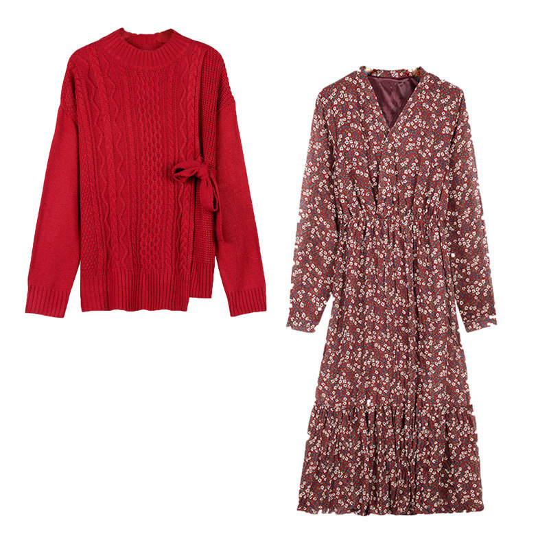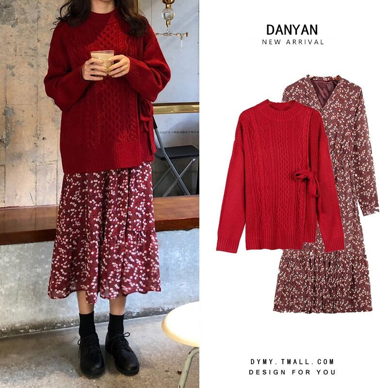 2021 Autumn Winter Dress New Gestation Maternity Dress Netred Suit Foreign Pie Red Sweater With a long version of two sets