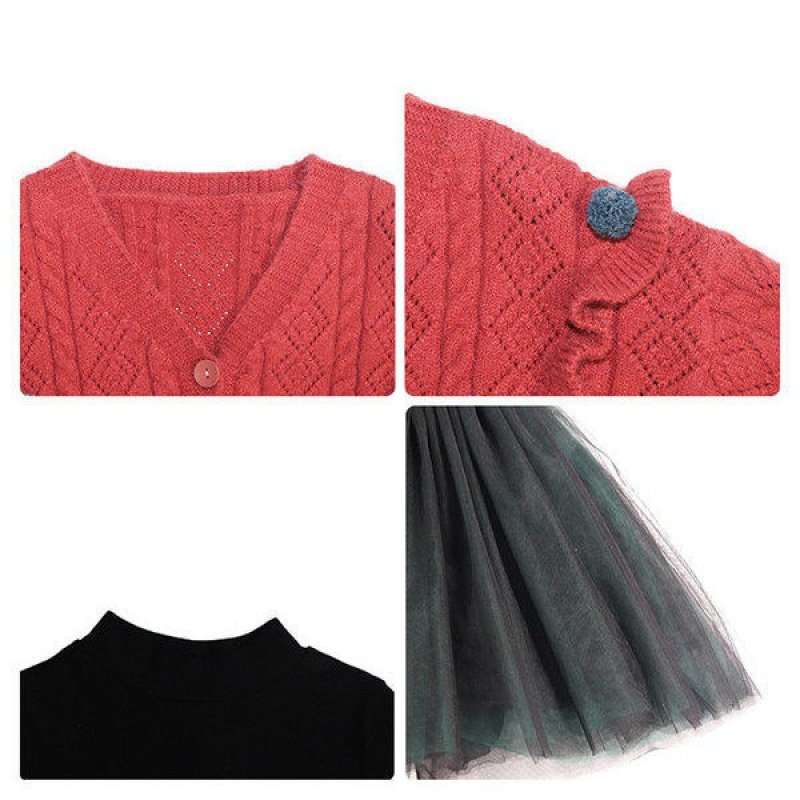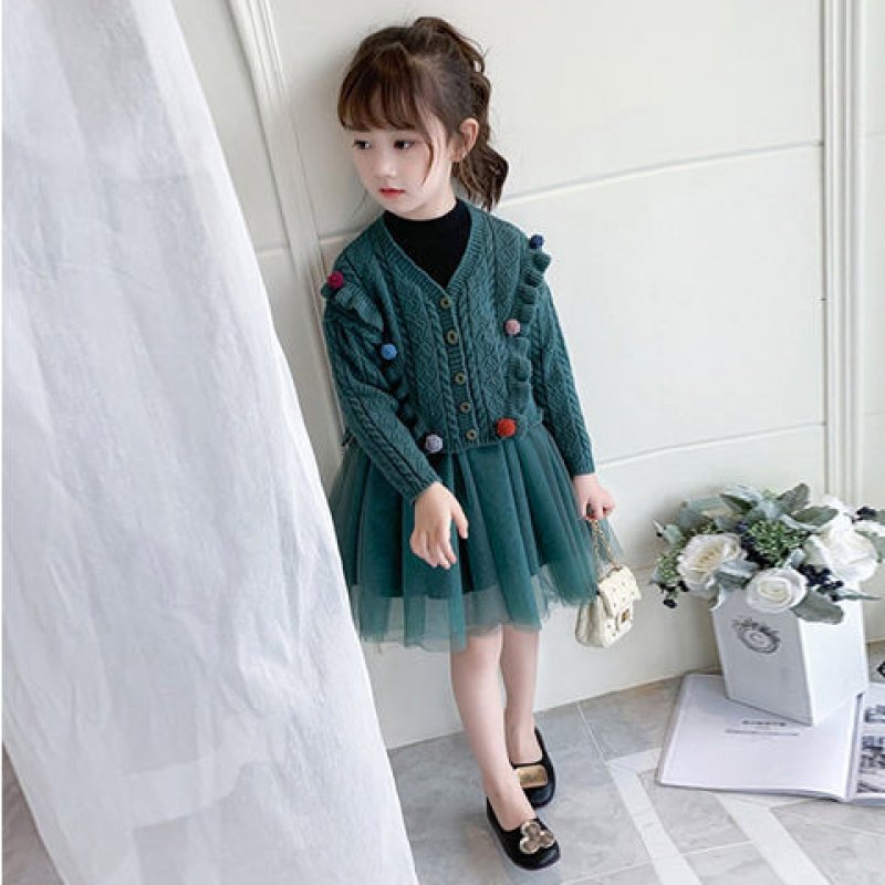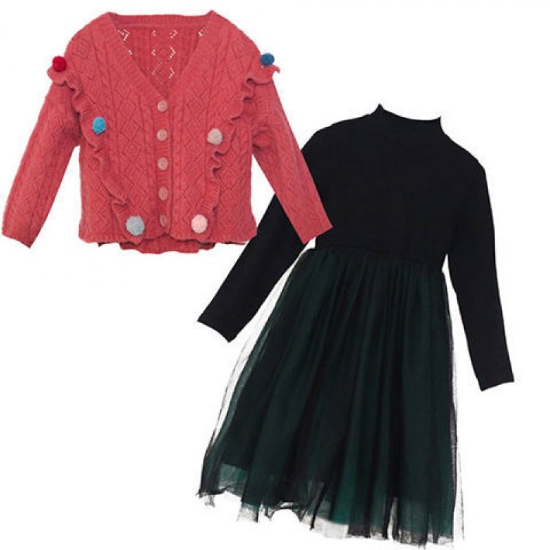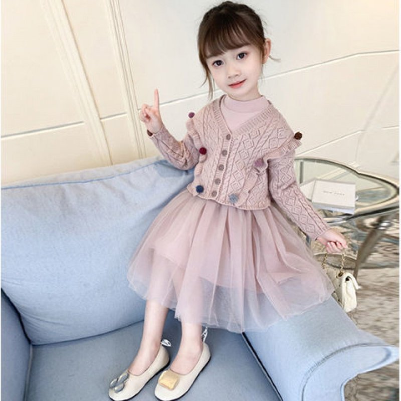 Girls' autumn suit autumn and winter thickened fashionable knitted long sleeve cardigan mesh skirt little girl dress two-piece set