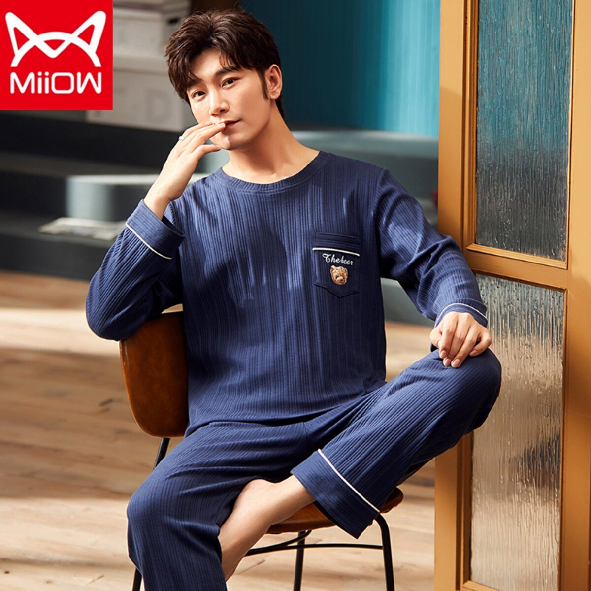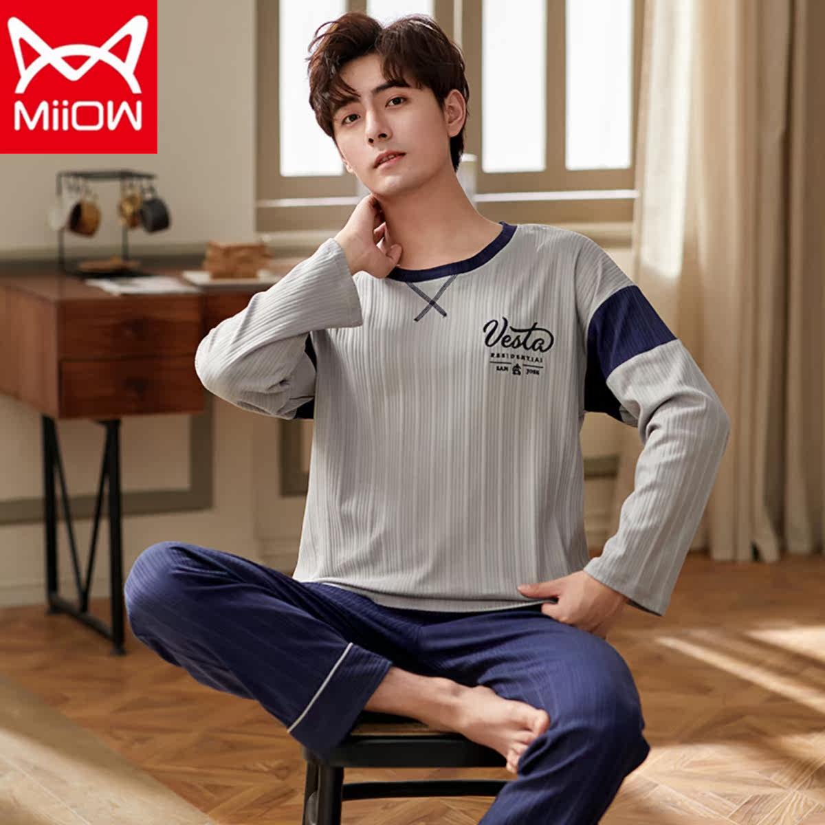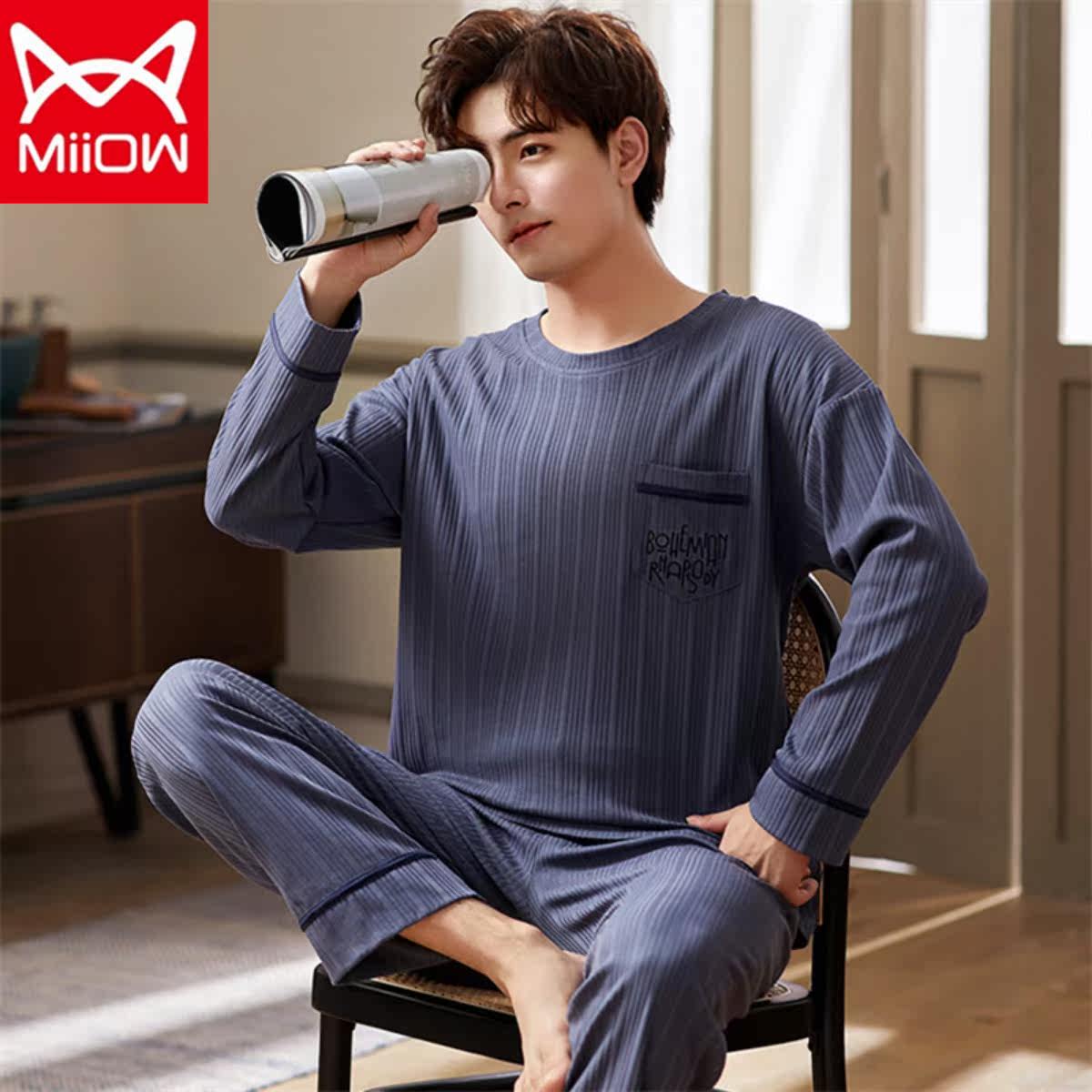 Catman men's pajamas pure cotton long-sleeved spring and autumn styles can be worn outside youth autumn and winter cotton thin section home service suit
