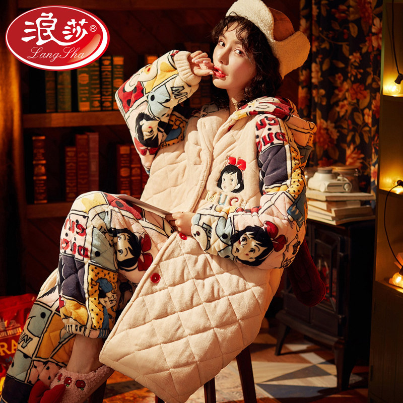 Coral velvet lady thickened three layers of cotton overthick suit winter lady flannel dressing gown