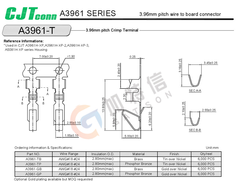 A3961-TB CJT Yangtze River connector Original loading pressure line terminal spacing P= 3 96MM