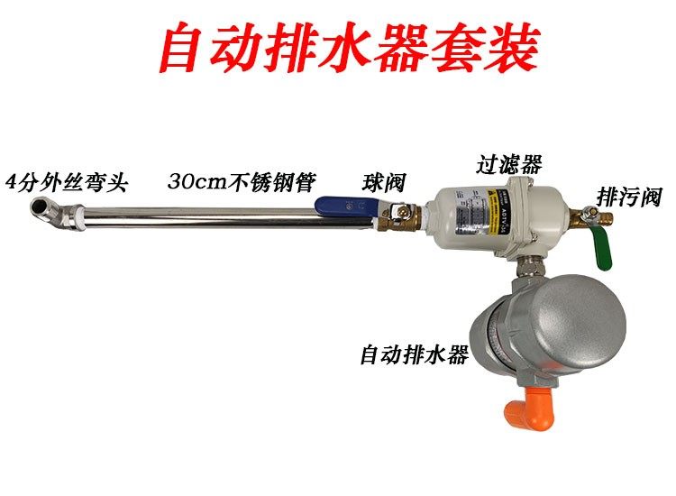 Pneumatic drainer pneumatic drainer water drainer suit mounting fittings 1 (front filter} mounting fittings 2 (pipe elbow ball valves) mounting fittings 3 (pipe elbow ball valves) mounting accessories