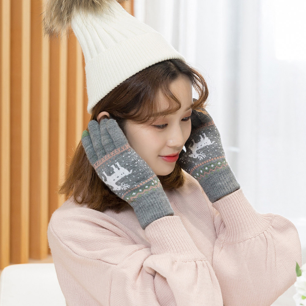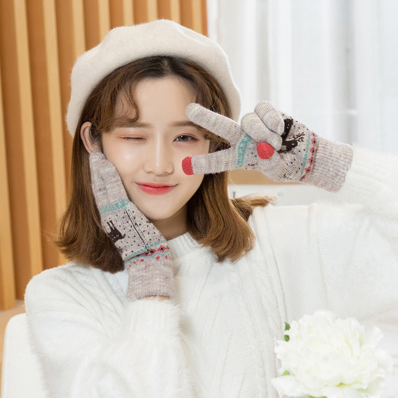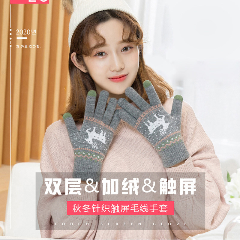 Korean version of cute double padded fawn gloves women's winter knitted five-finger touch screen wool warm student car gloves