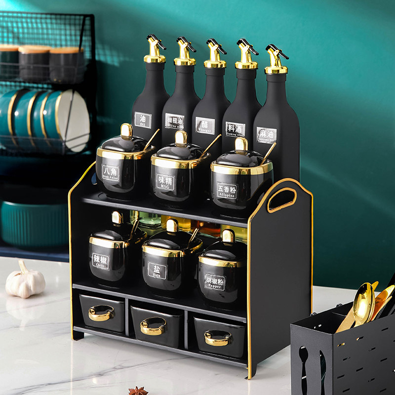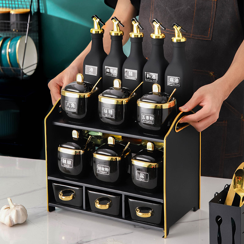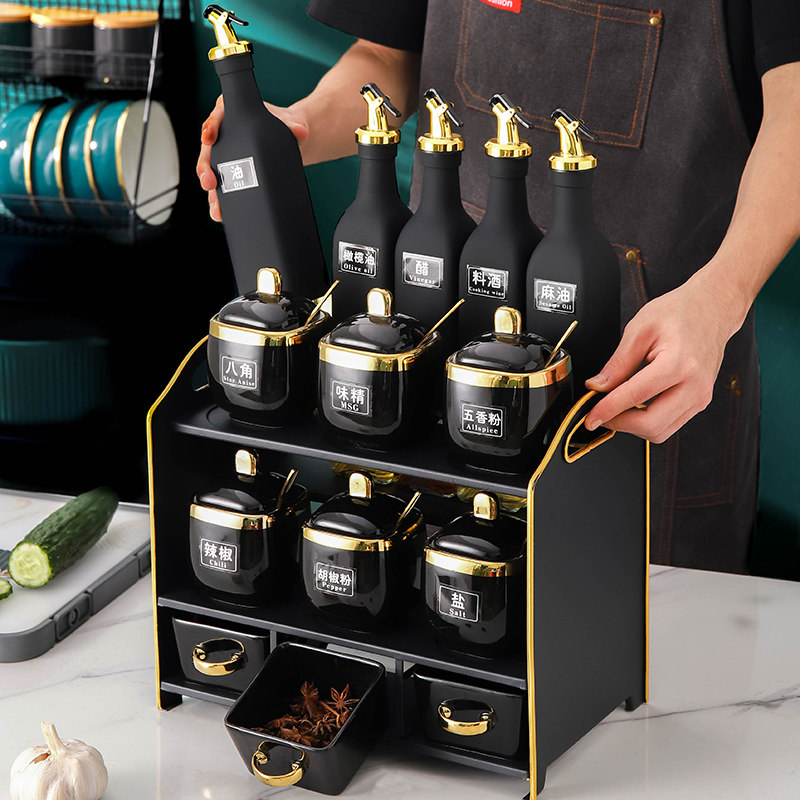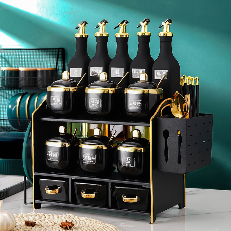 Household salt pot sauce vinegar pot wrought iron storage rack combination set kitchen salt pot oil pot seasoning seasoning bottle jar