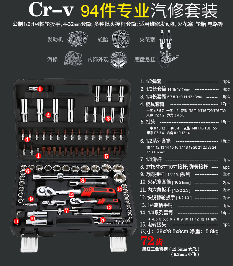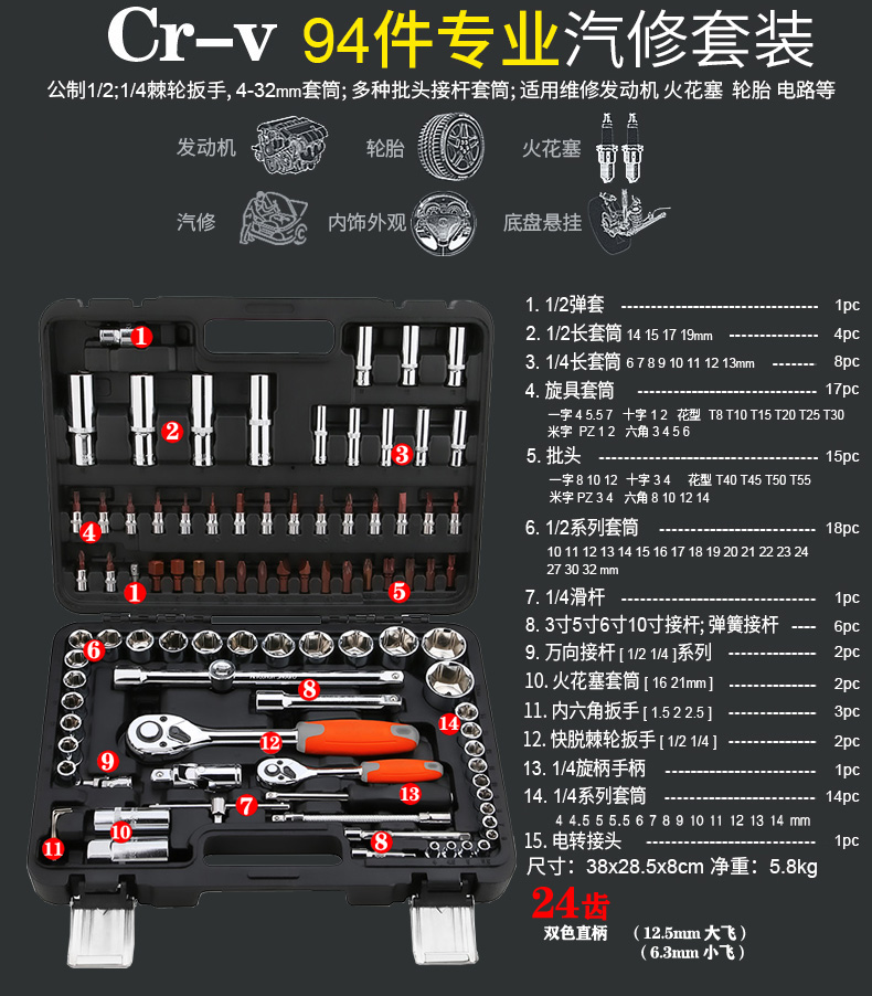 94-piece sleeve set combination wrench Auto repair hexagon cross word plum hexagon tool set