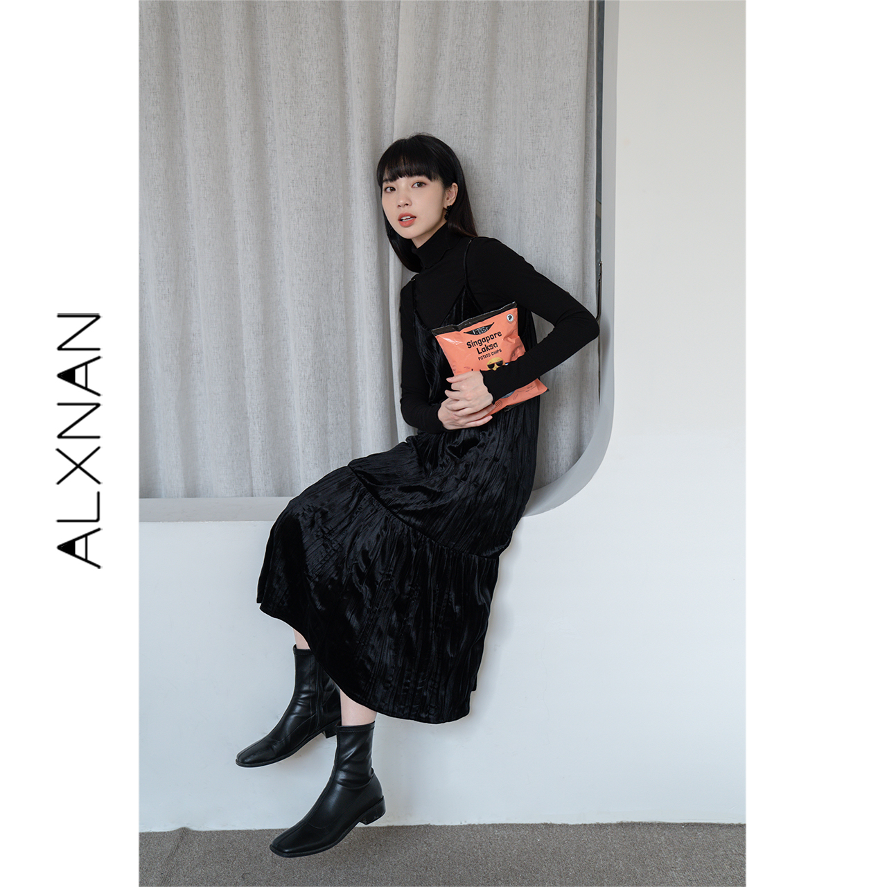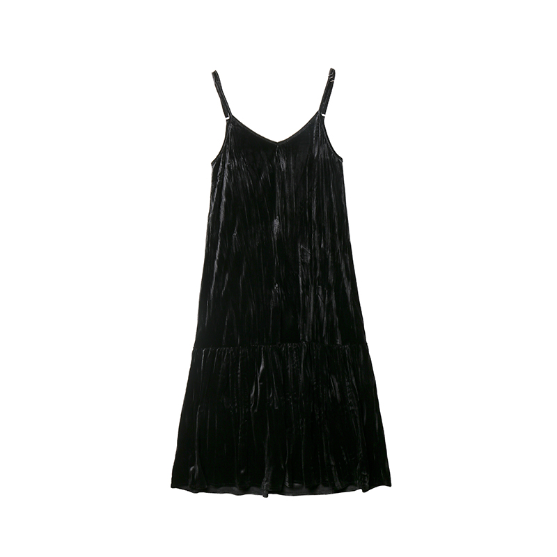 Deer South Black Velvet Harness Ocean Dress Woman Spring Autumn New style Folds Temperament in Long Edition Inner Lap Dresses