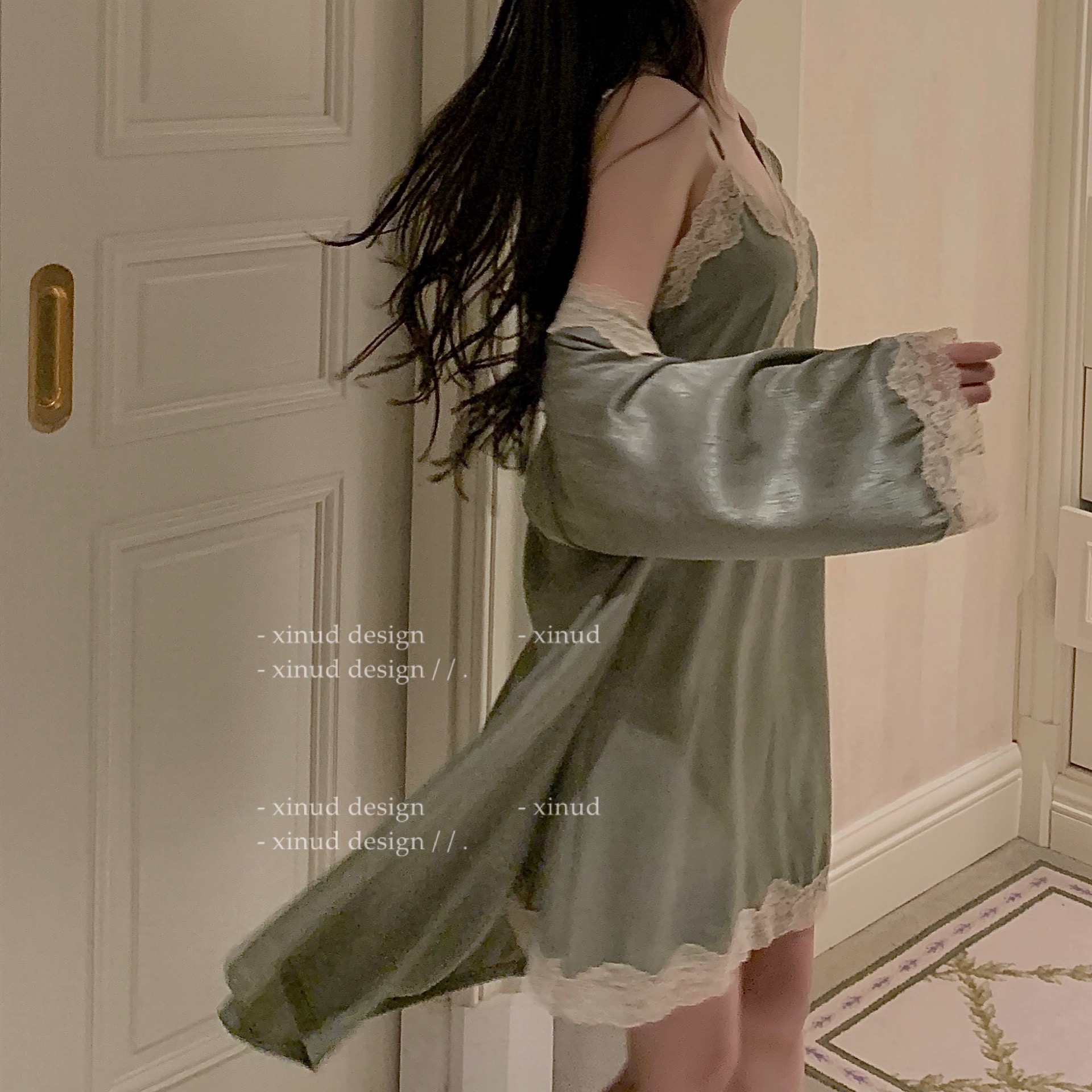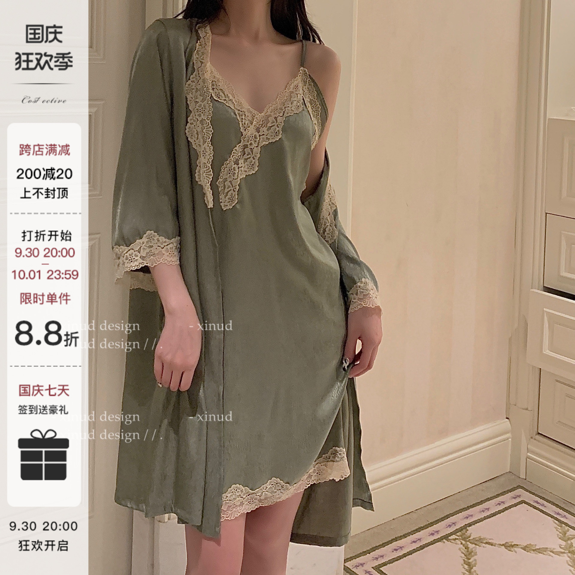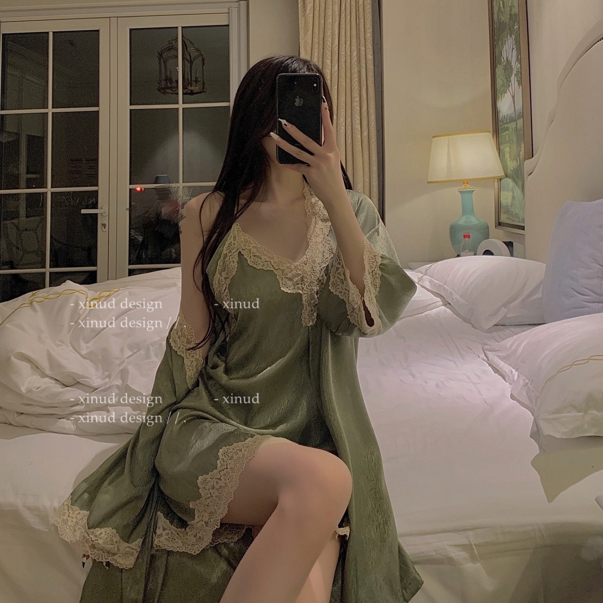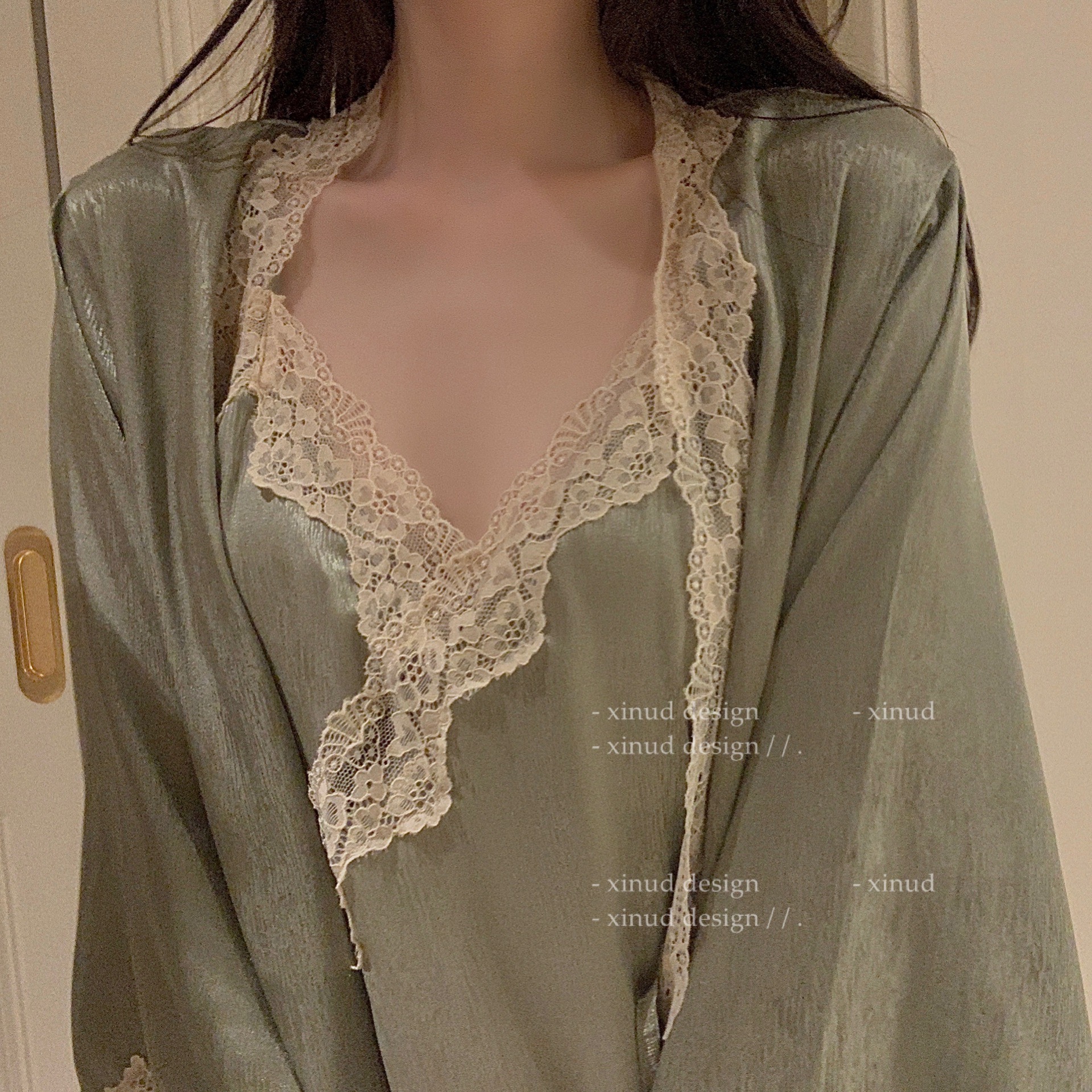 "LA" Monet Manor* silk suspender nightdress two-piece sexy lace home service V-neck spring and autumn nightgown women