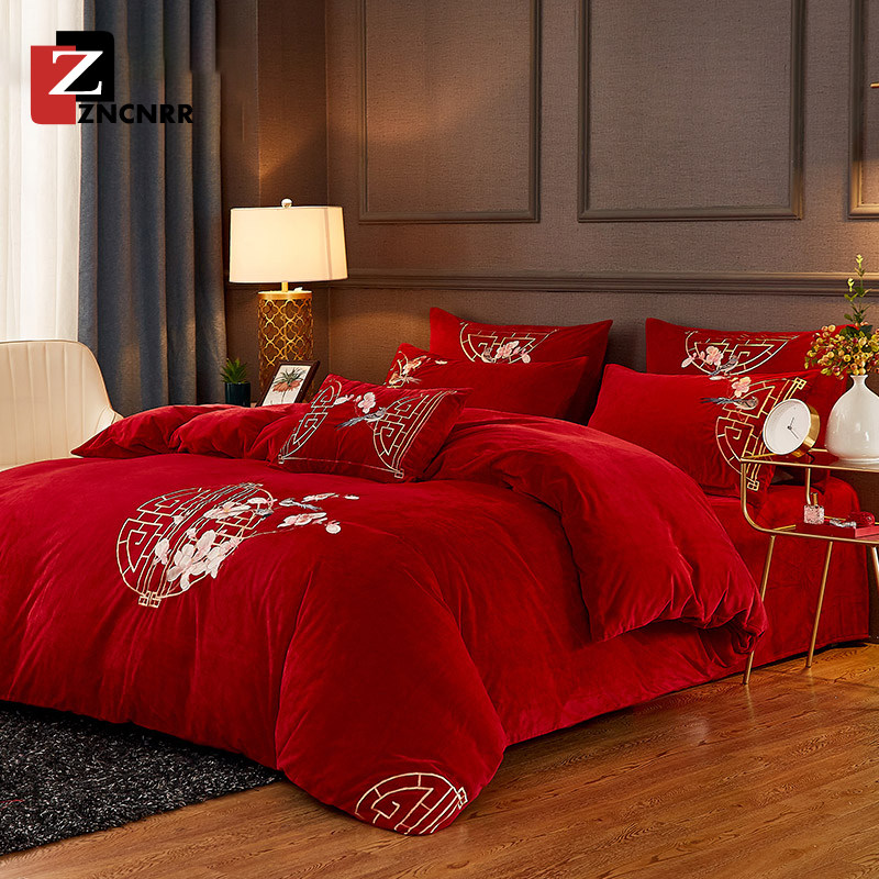 Coral velvet four-piece wedding bedding Chinese red wedding duvet cover flannel thickened autumn and winter bed sheet