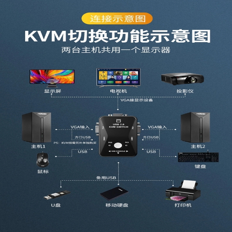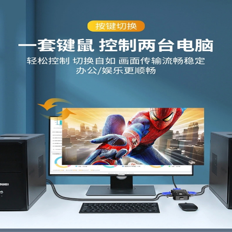 KVM switch 2 port VGA host to monitor computer screen one drag two keyboard mouse port two in and one out