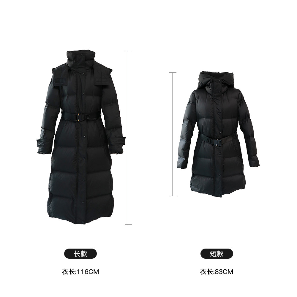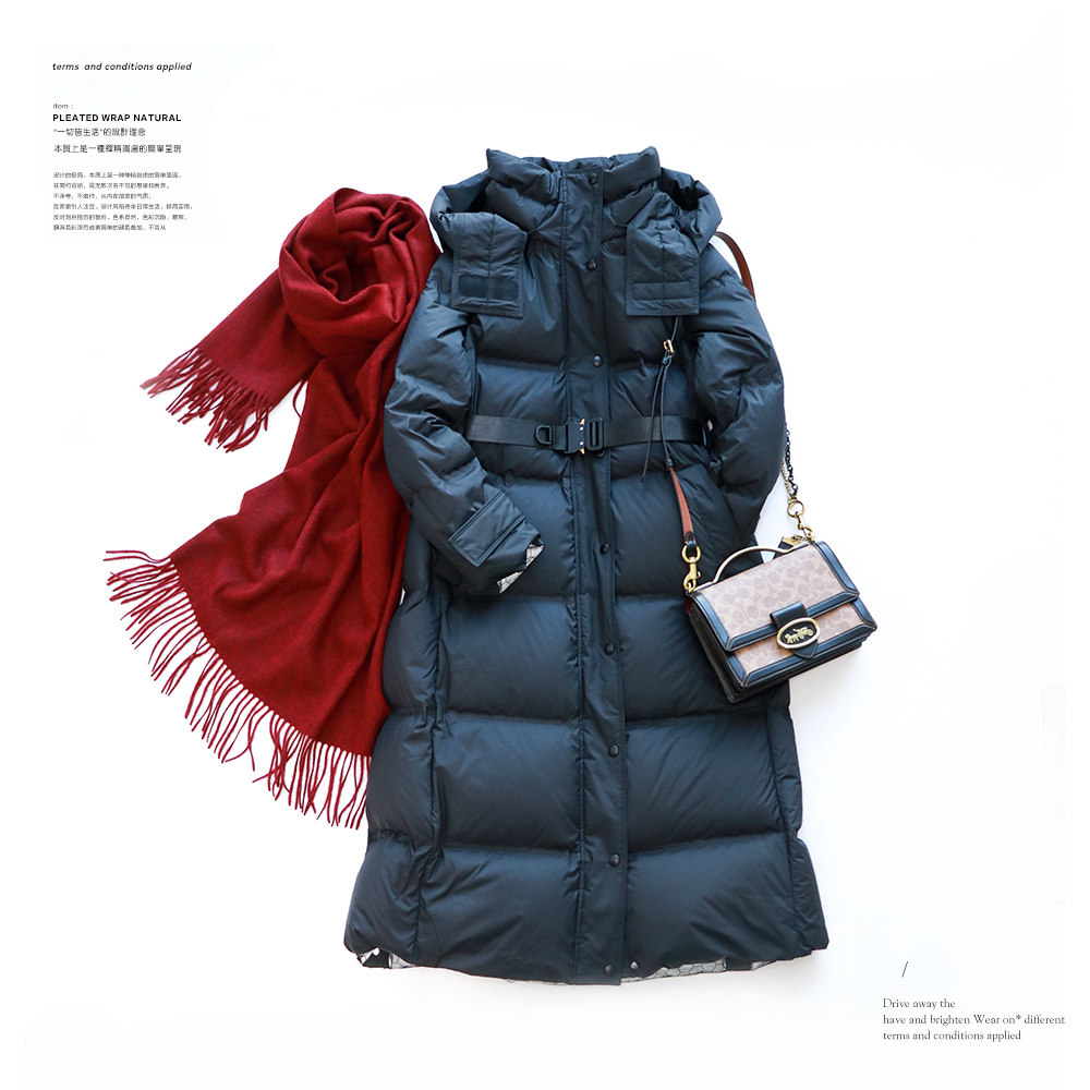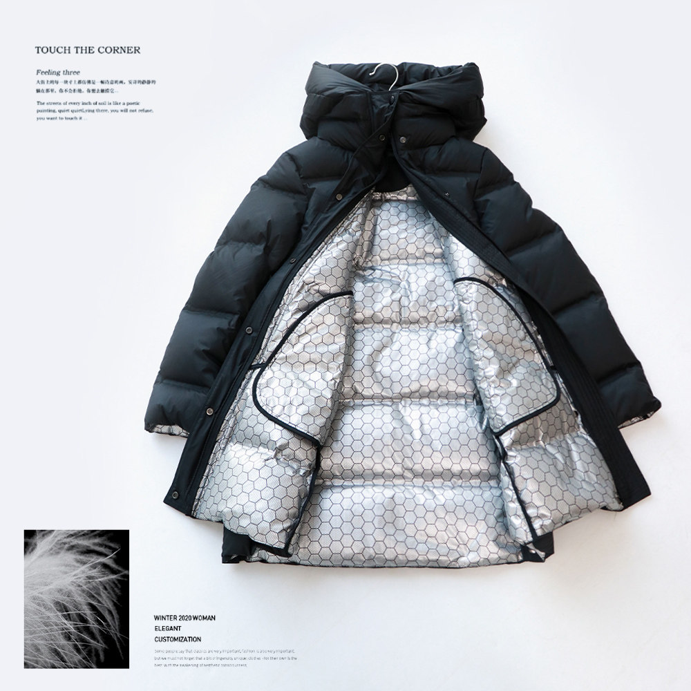 Library Yin December Black tech self-heating cold winter BI preparation white goose down long version with hat down jacket light and warm