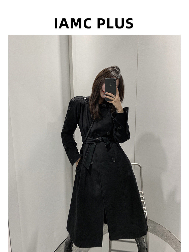 IAMCPLUS dark black fashion sexy stunner exposed collarbone wool can wear a long version of trench coat women's coat