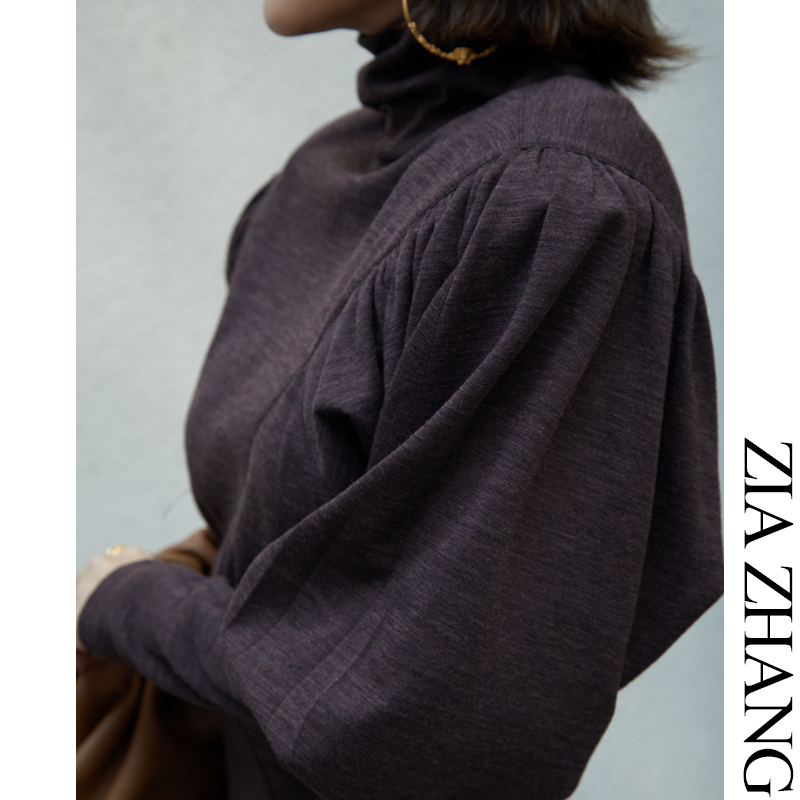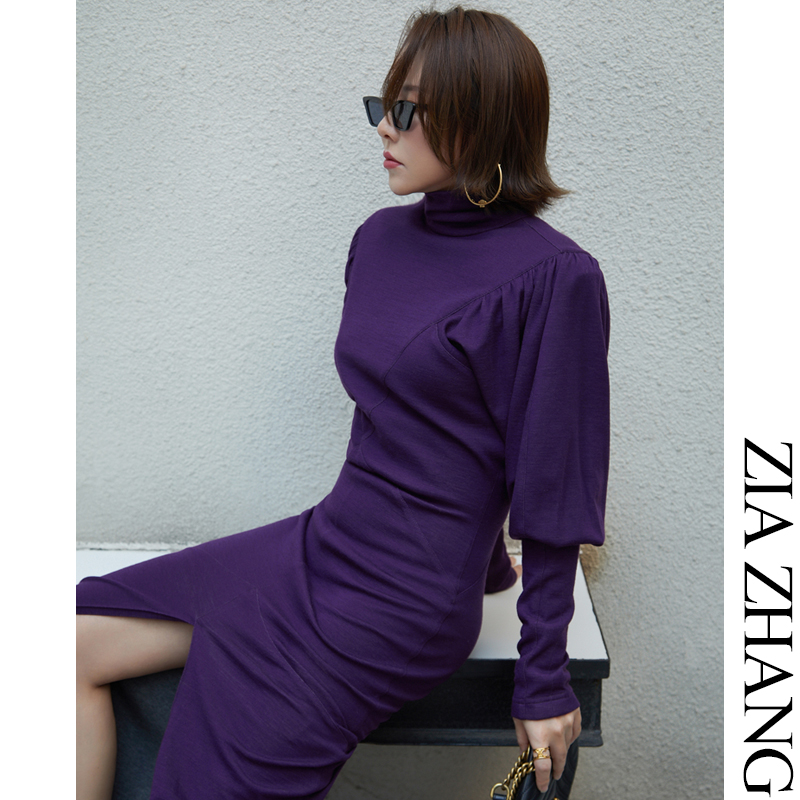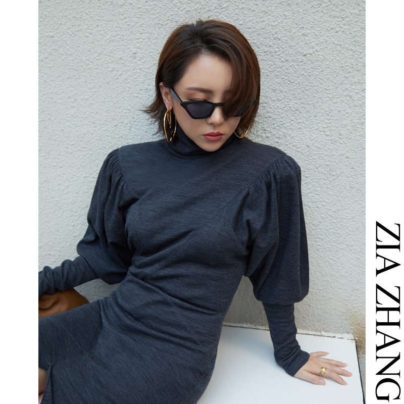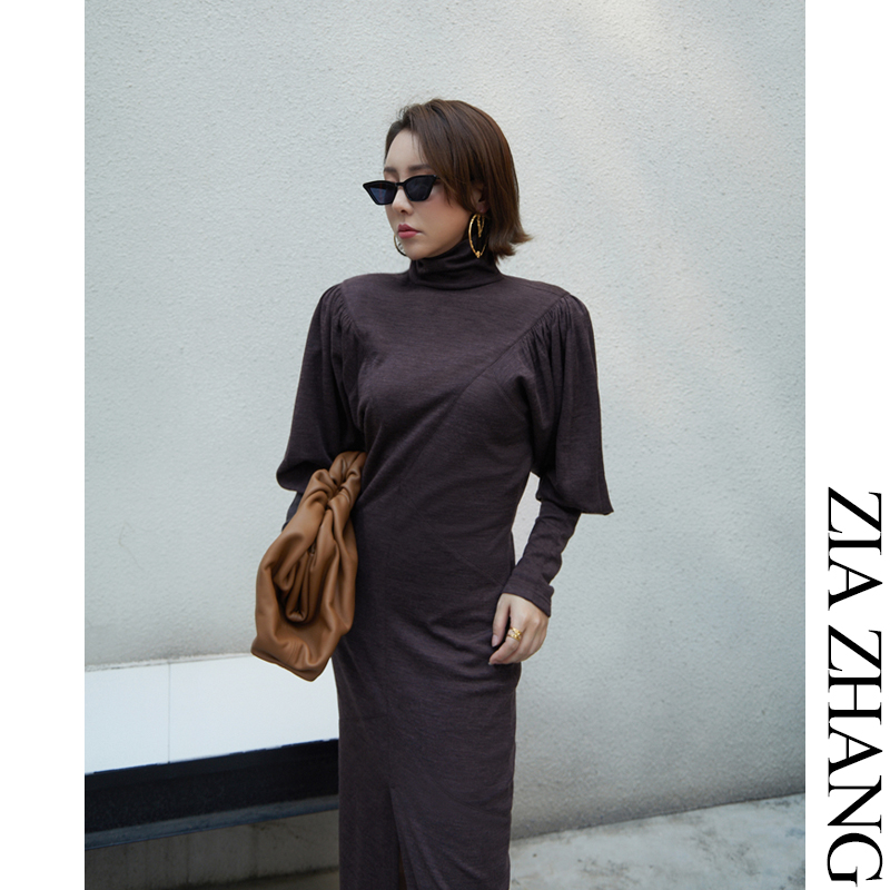 Boss Z wool X-shaped dress, removable shoulder pads, stand-up collar, pleated horseshoe sleeves, mid-length dress for women