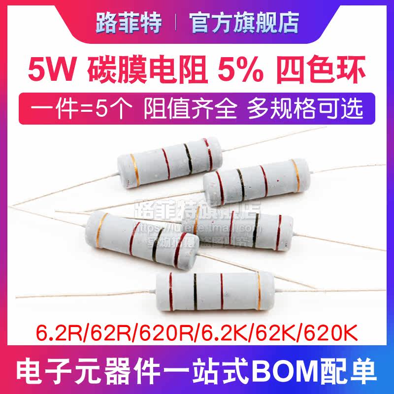 5W Carbon Film Resistor 5% Four Color Ring 6 2R 62R 620R 6 2K 62K 620K Ohm Resistor