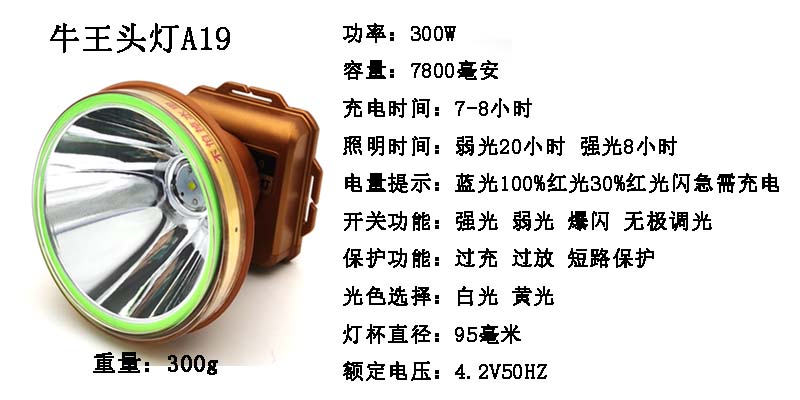 Bull King Head Lamp 300W Glare charging ultra-bright waterproof far-shot torch mine lamp A15A18 A19 outdoor yellow light
