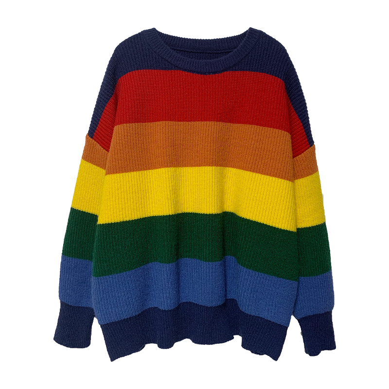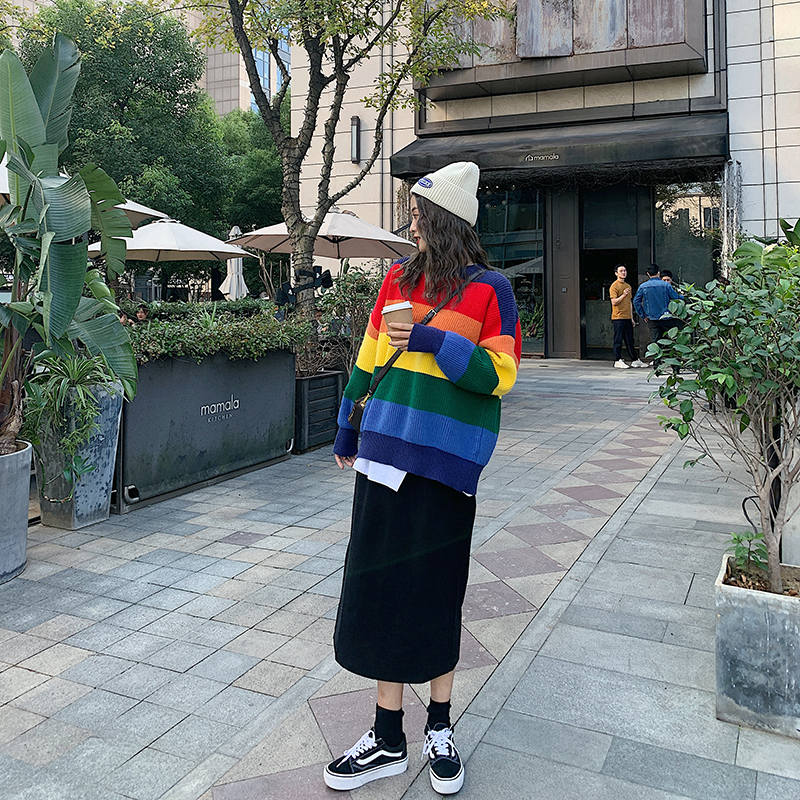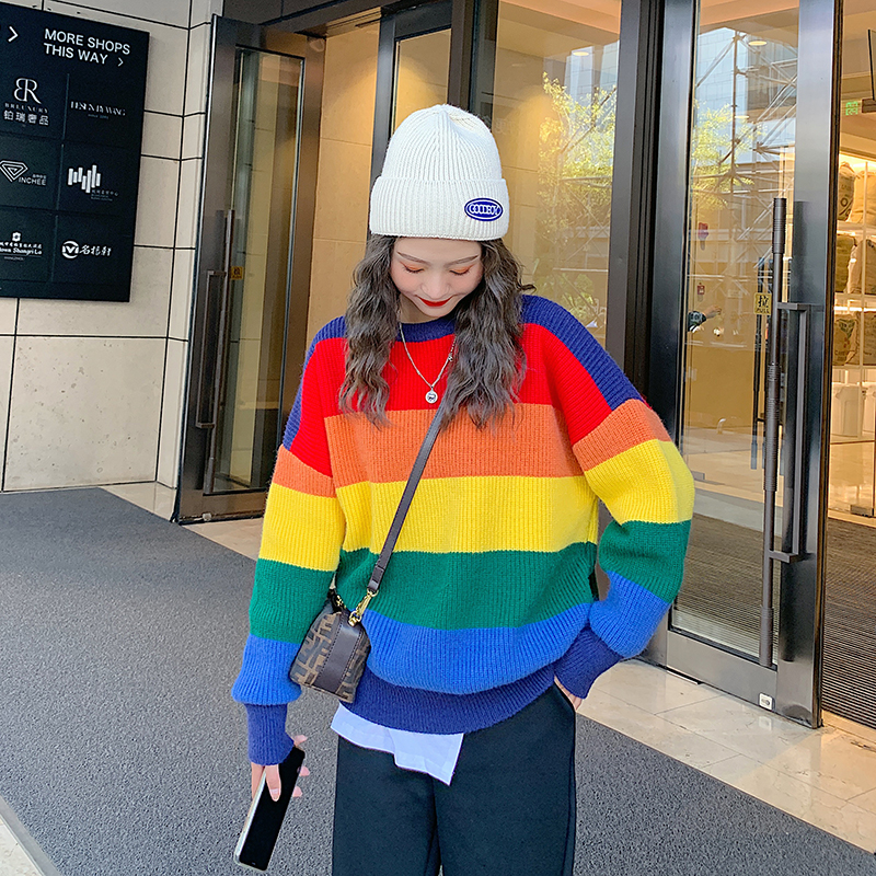 Rainbow sweater women's spring and autumn thin section 2021 new loose outside wear Western style fried street Western style knitted striped top