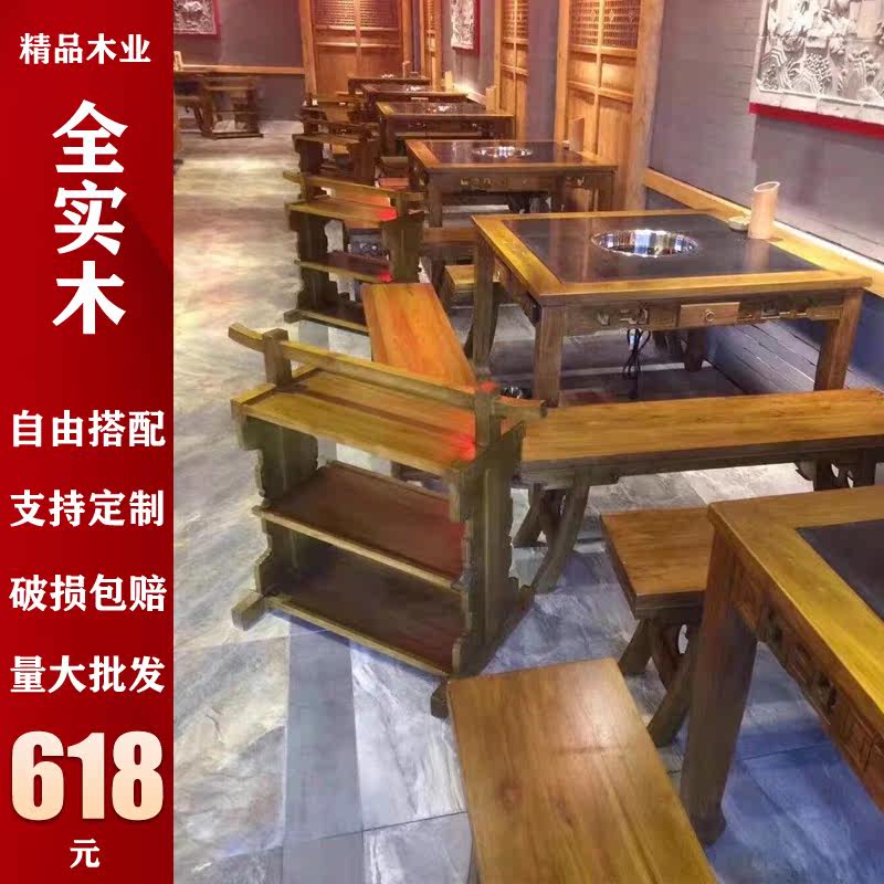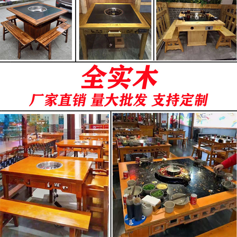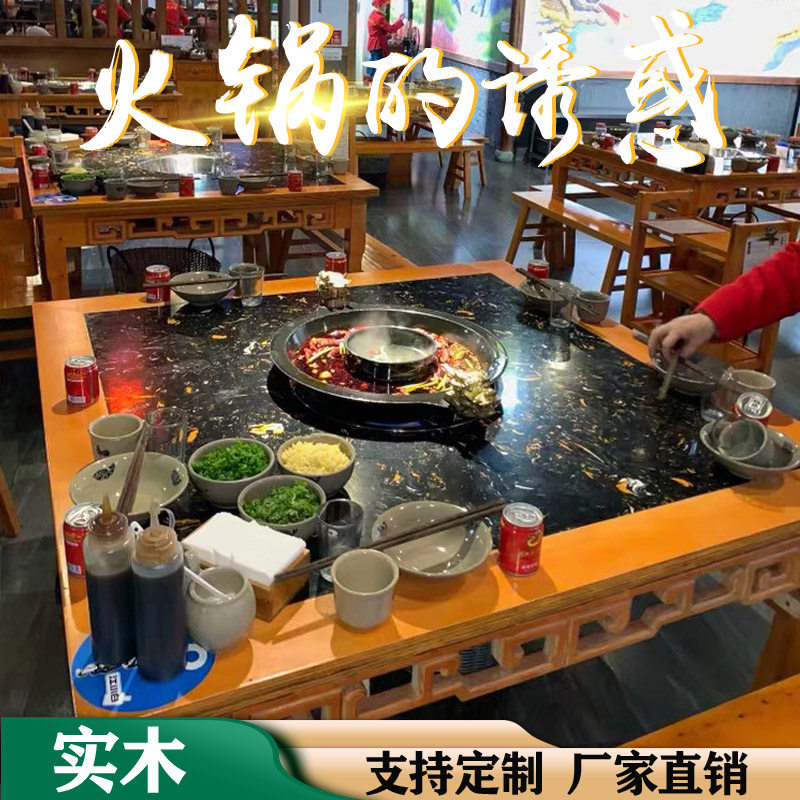 Customized solid wood hot pot table commercial marble skewer incense round table induction cooker smokeless integrated hot pot table and chair combination