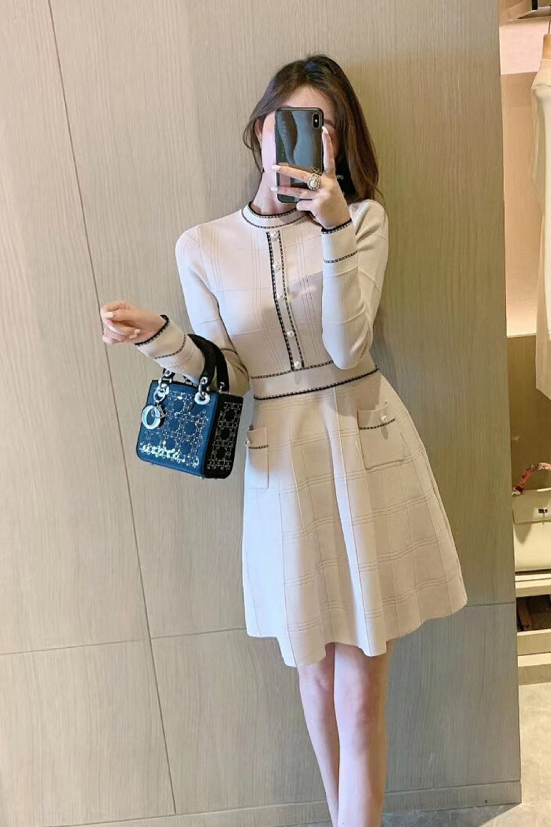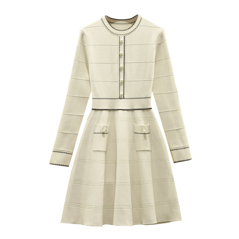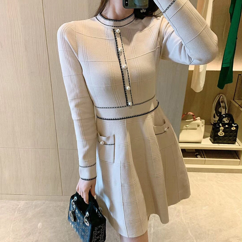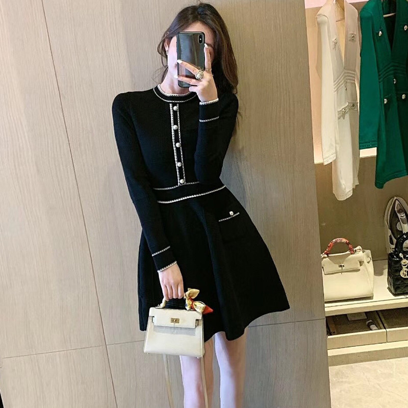 Fan-style Korean version of autumn and winter elegance small and fragrant wind collider with bright line collection waist pearl buckle knit to bottom skirt A character foreign dress