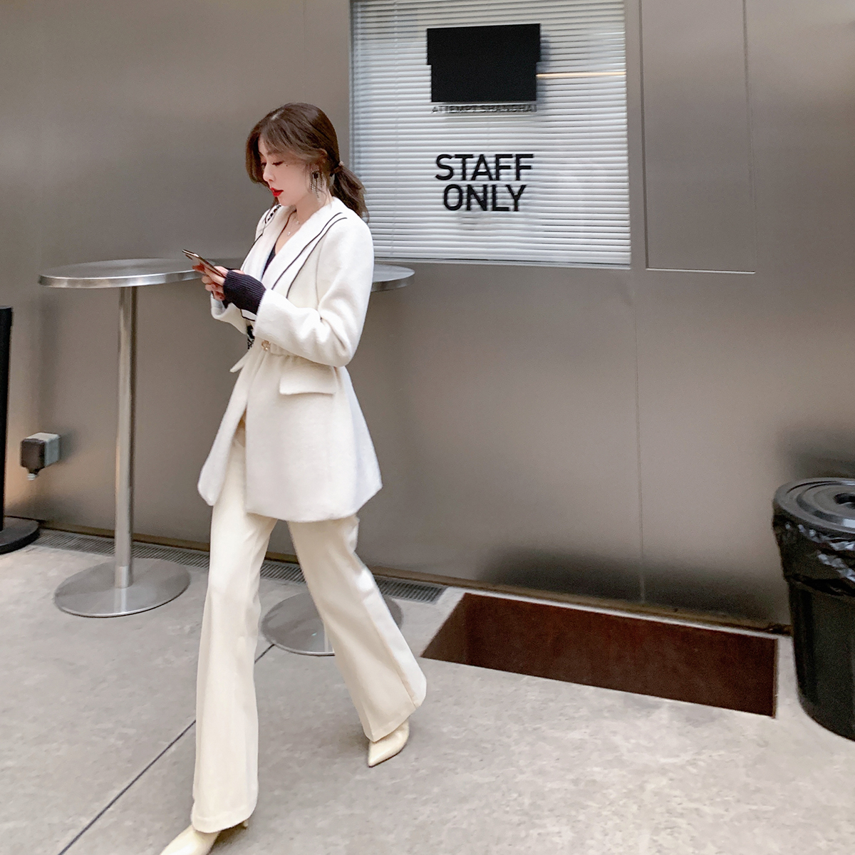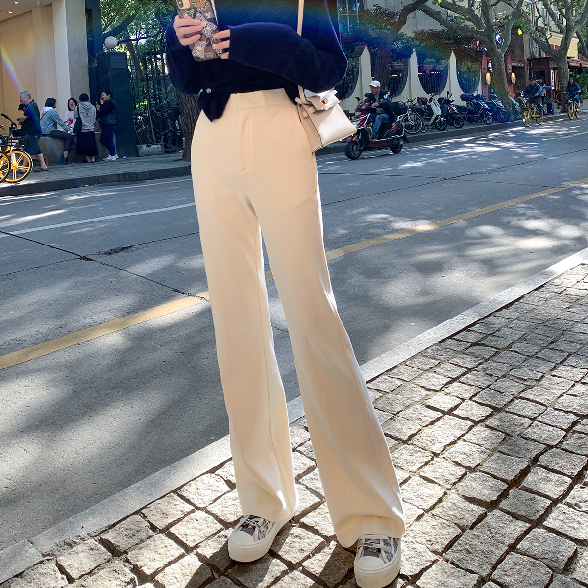 ByYou spring new white hairy pants woman with slim pituitary horn pants high waist wide leg thickened casual long pants
