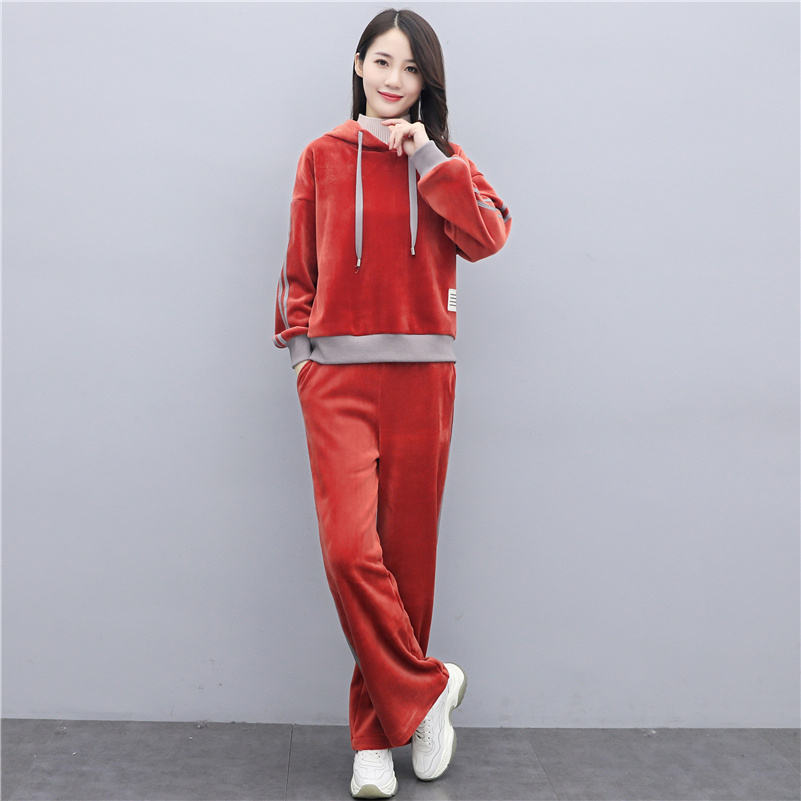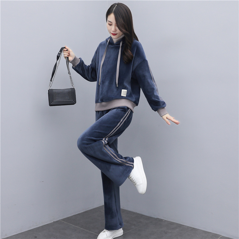 Plus velvet thickened double-sided velvet casual sports suit women's 2022 hooded high-neck stitching thick T-shirt wide-leg pants two-piece set