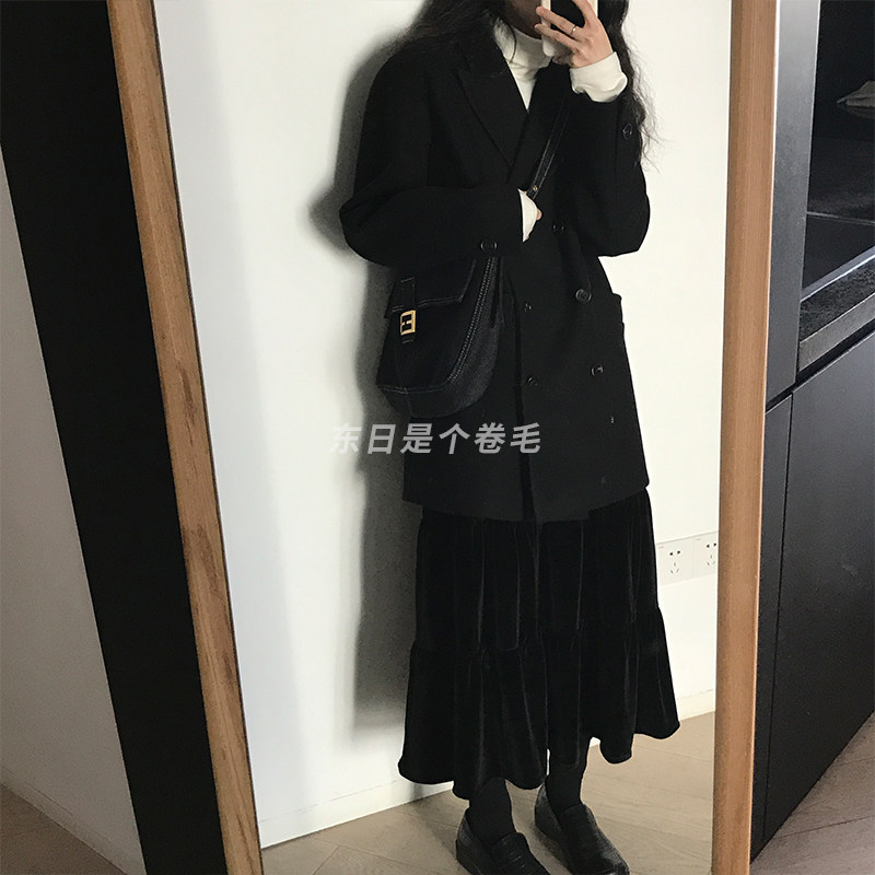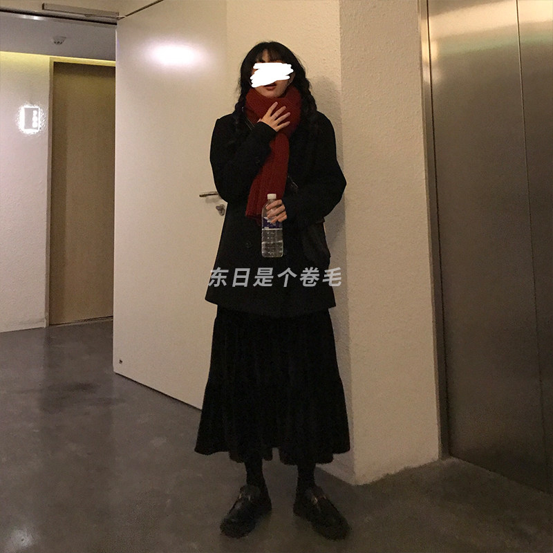 Dongri is a curly retro elastic waist gold velvet skirt Autumn and Winter women's new black hanging a-line dress