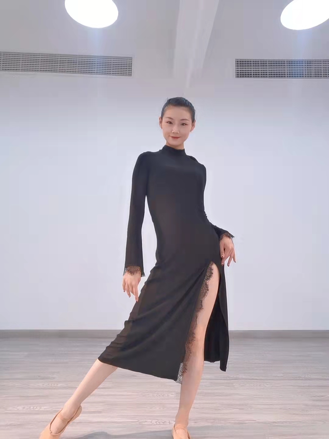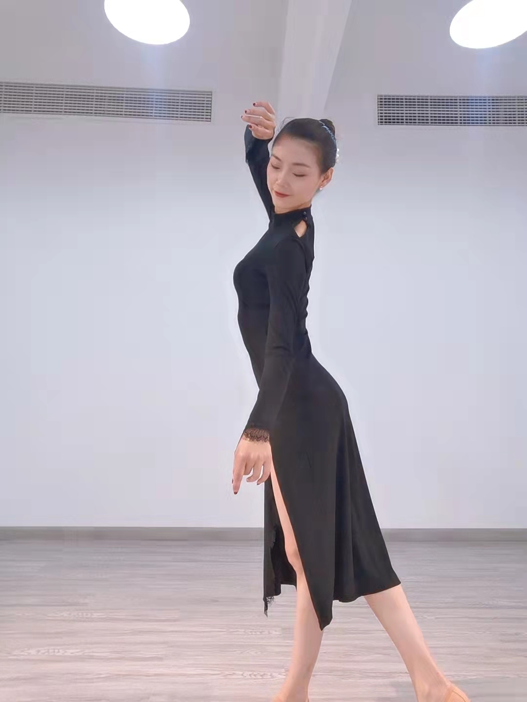 Xiaoyinger Rolling Red Dust Republic of China Style Chinese Dance Costume Black Lace High Elastic Slit Modern Dance Cheongsam