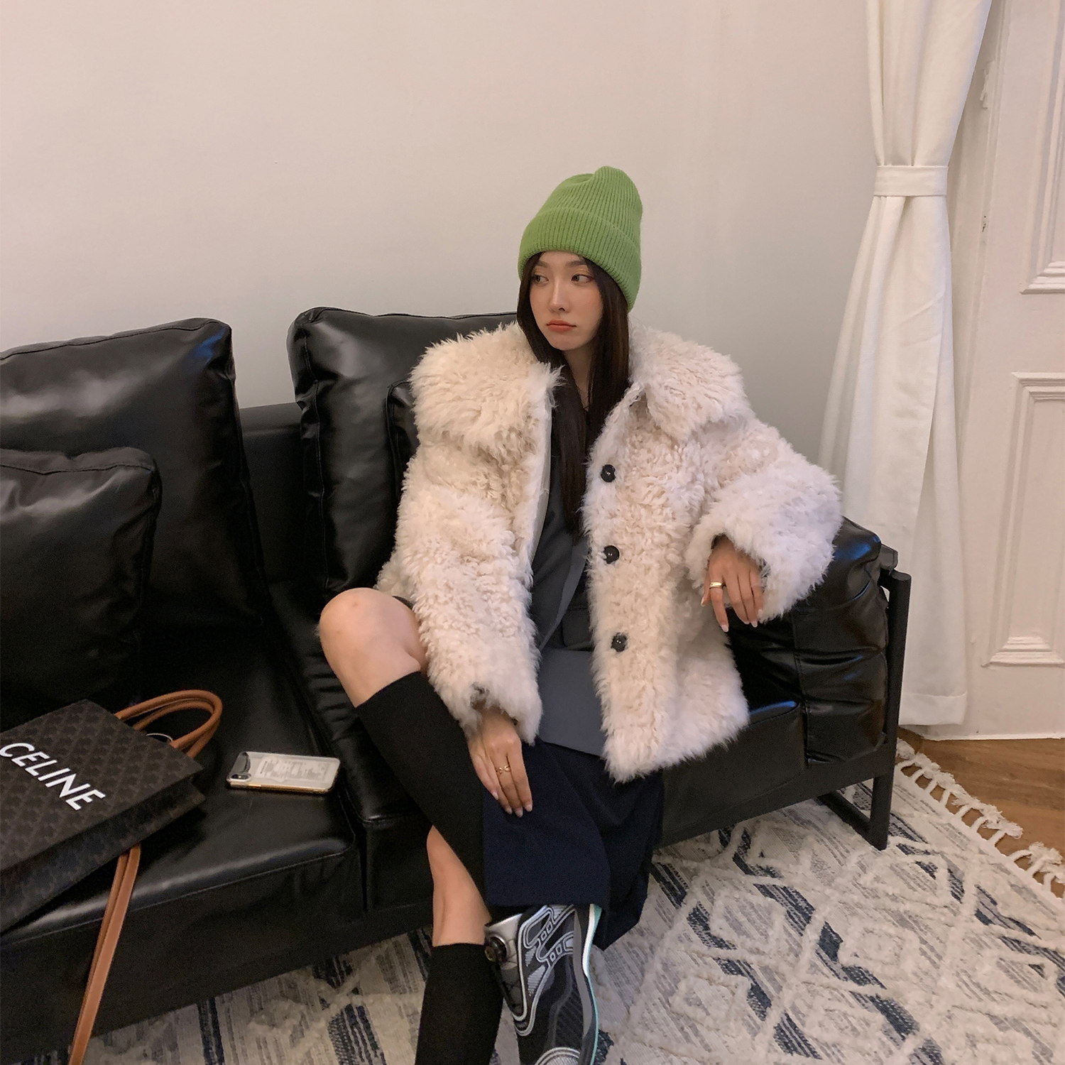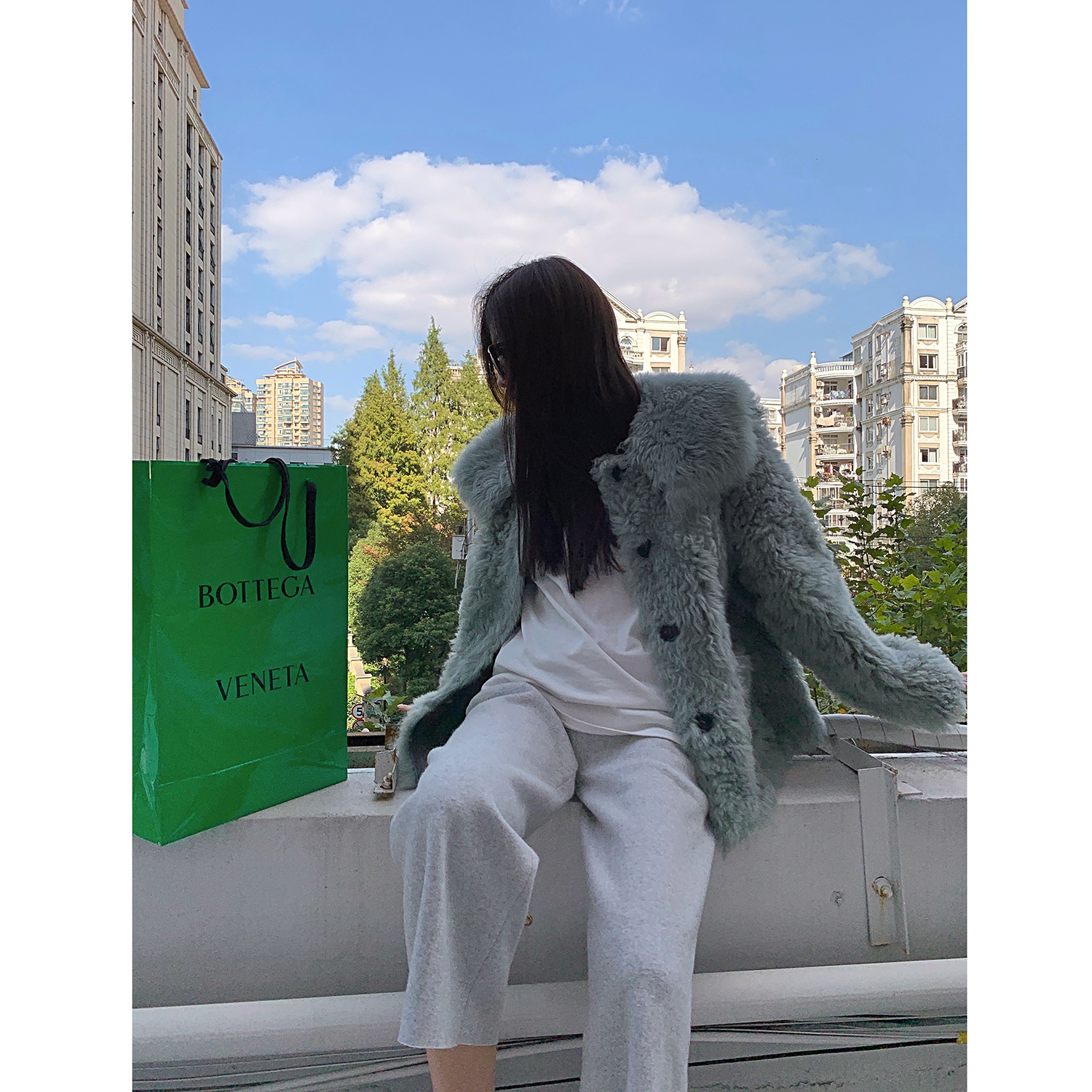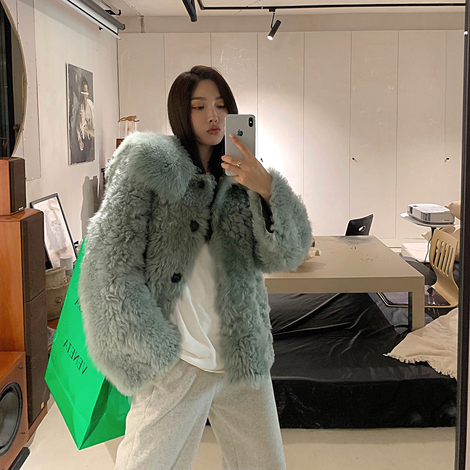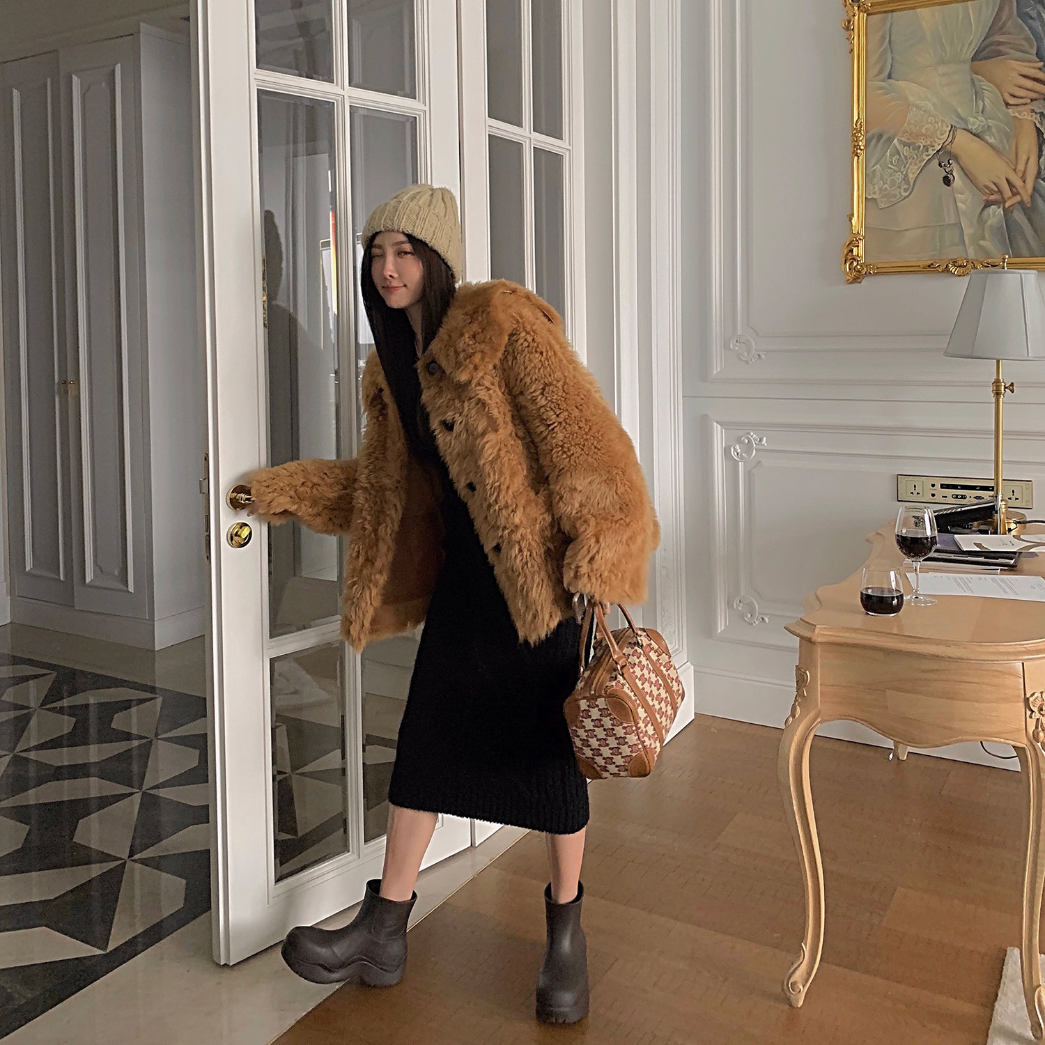 Fu Zhien caramel milk green imported Tuscan fur all-in-one women's retro leather fur coat winter