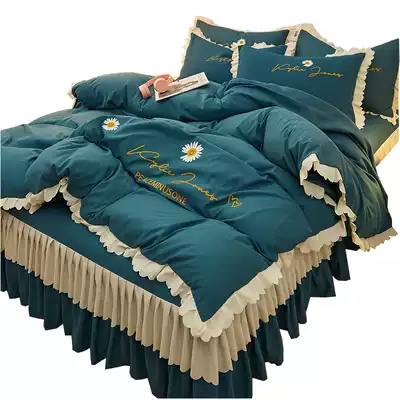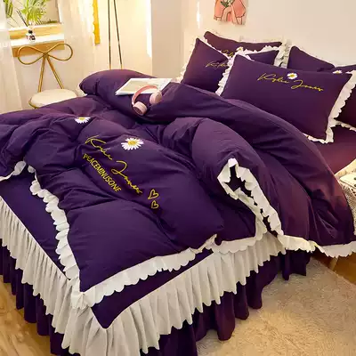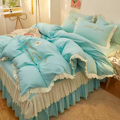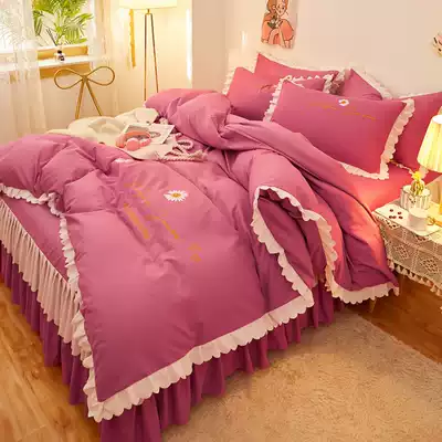 Net red cotton double bed skirt four-piece cotton simple lace quilt cover girl solid color bed sheet bed spread 4