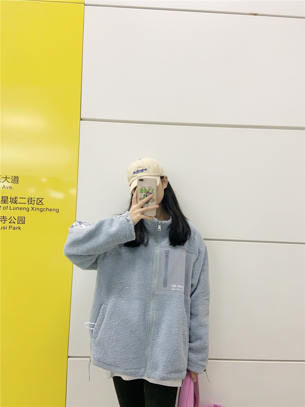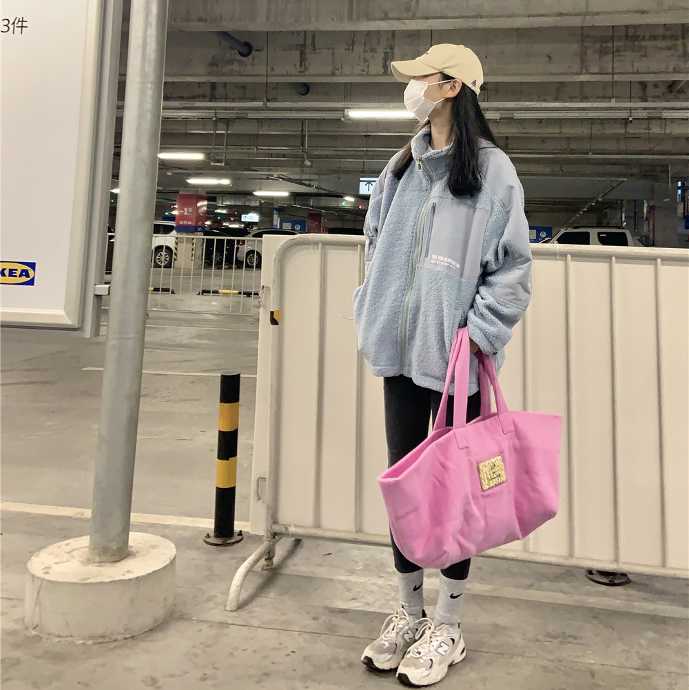 South Korea smog blue stand collar lamb wool jacket women's trendy autumn and winter clothes all-match loose thickened lamb velvet jacket top