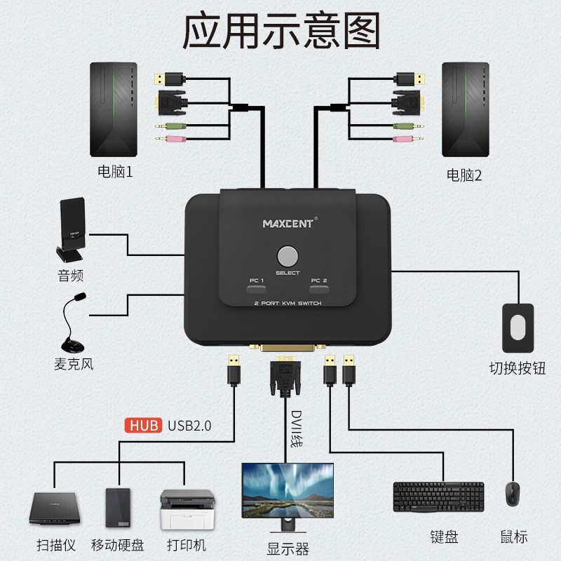 MaxCENT KVM Switch 2-port DVI USB mouse keyboard sharer binary one supports audio microprinter U disk AE-102DA