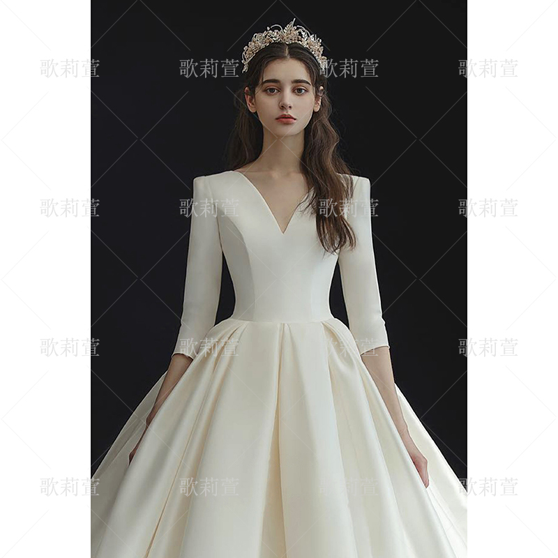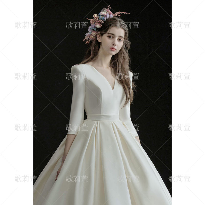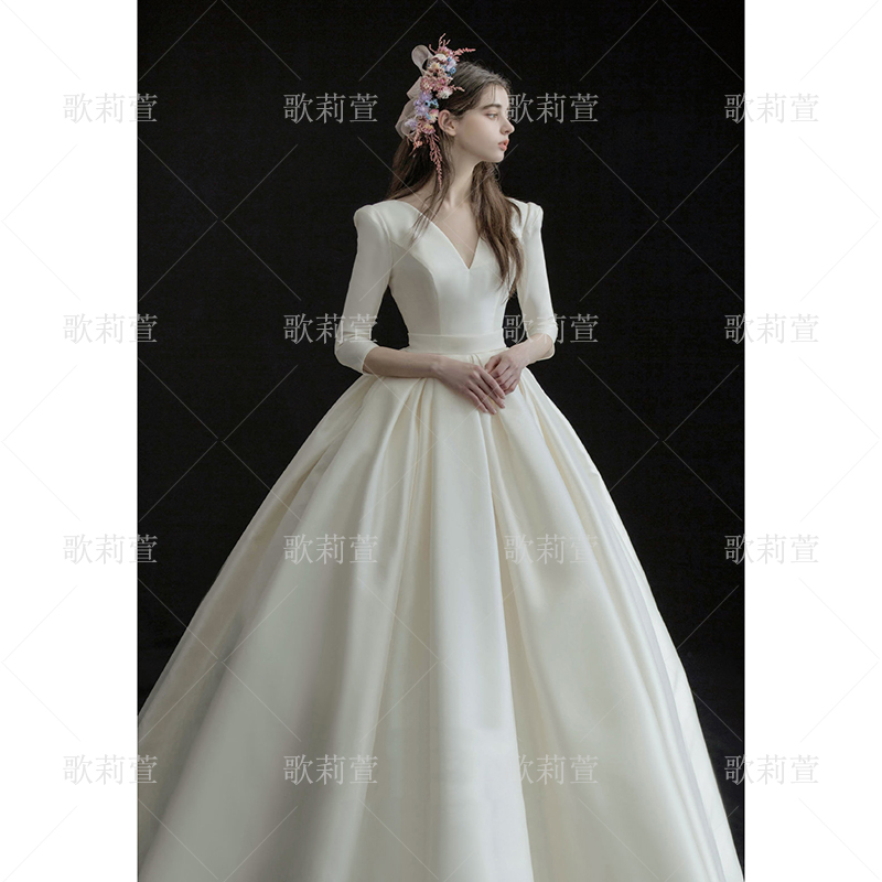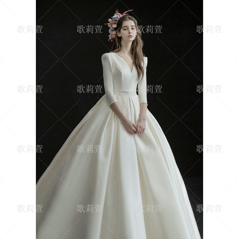 Long sleeve main wedding dresses 2021 new French style bridal satin minimalist V neckline dreamy trailing out of the house