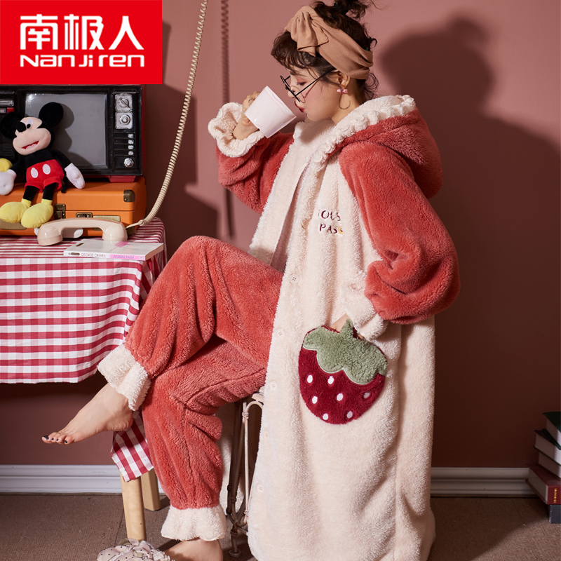 Antarctic people's autumn and winter coral fleece pajamas women's thickening plus velvet suit long version nightgown flannel hooded home service