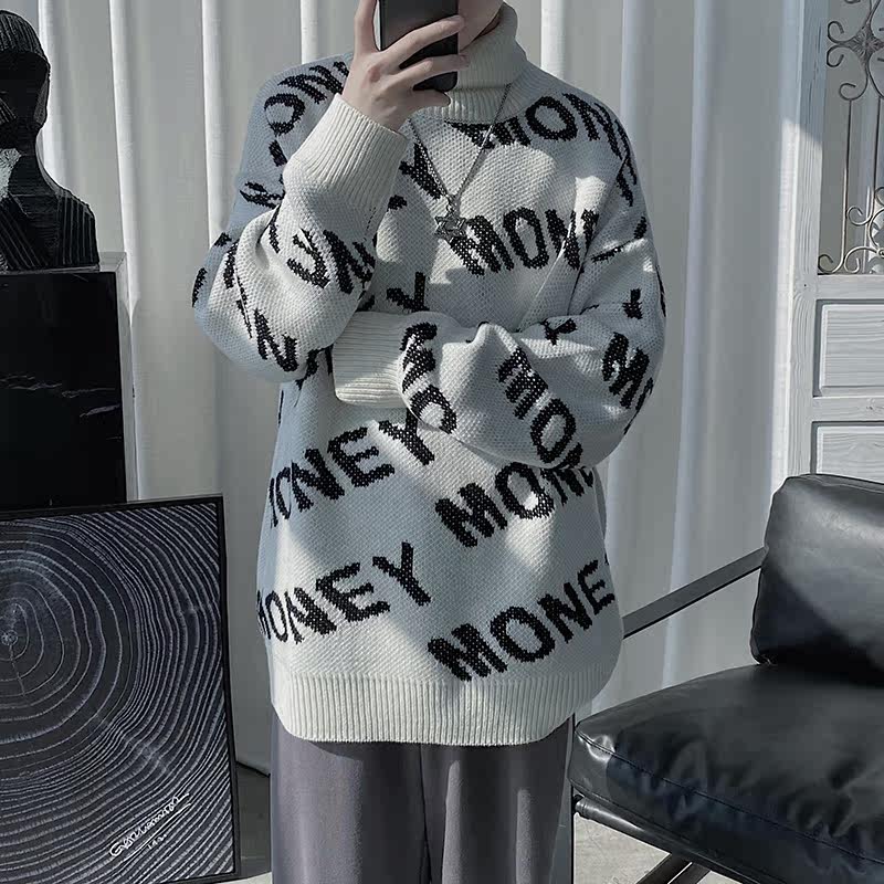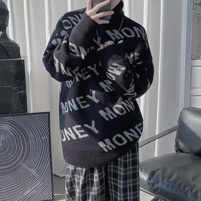 Port Wind Letter Printed Teenager High Collar Sweater Male Trend Jacket Head Autumn Winter Paragraph Outside Wearing Handsome Air-Knitted Sweatshirt Black