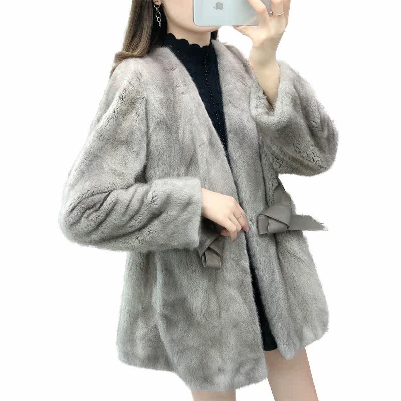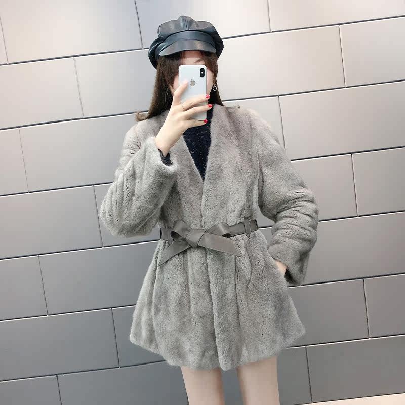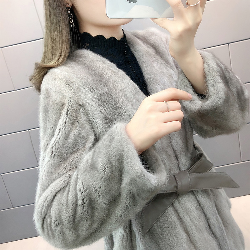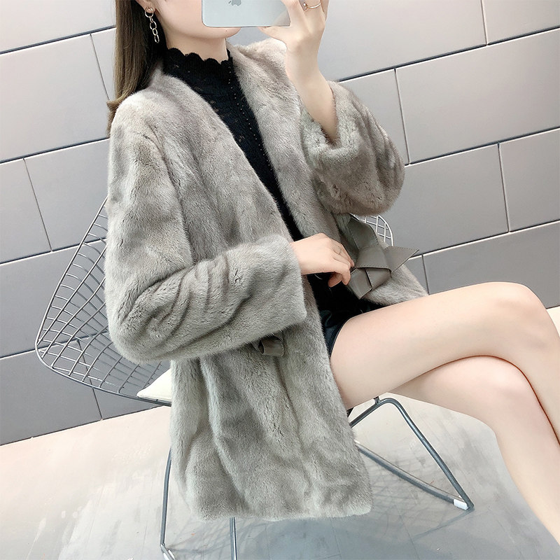 Mink fur coat women's whole mink mid-length imported mink fur coat mid-length V-neck looks thin and temperament young - Taobao