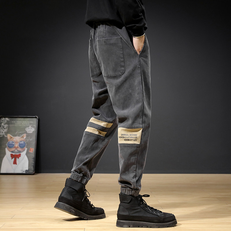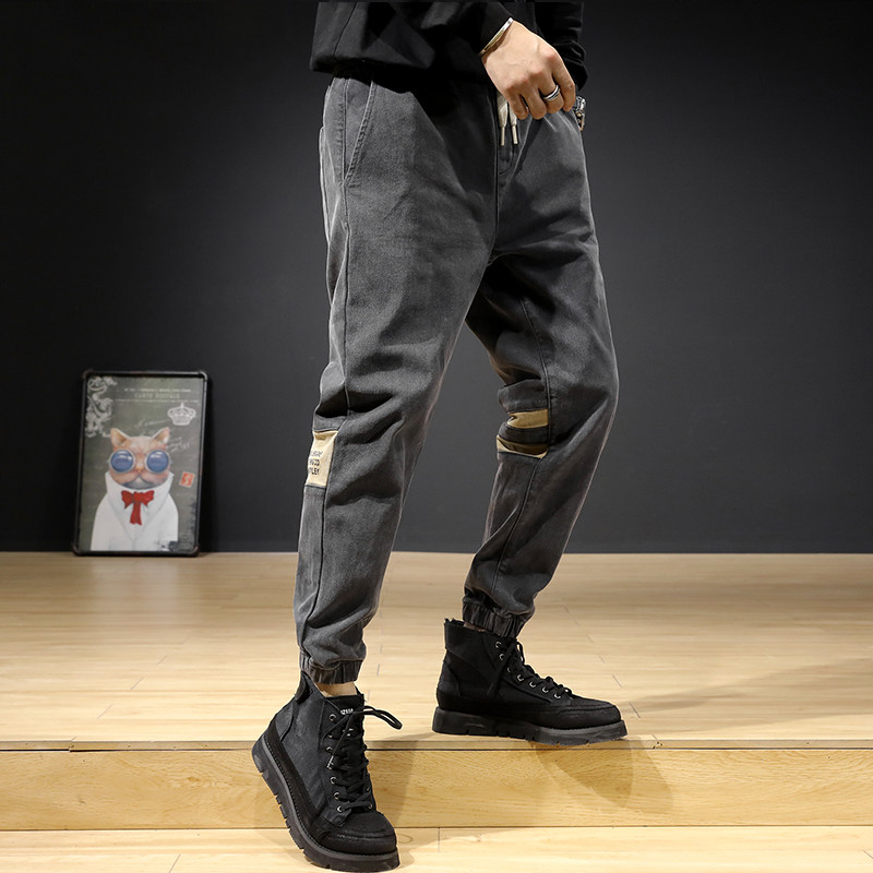 Spliced with smoky gray jeans New trendy men's pants with thickened bristles loose size Fat Harun corset pants