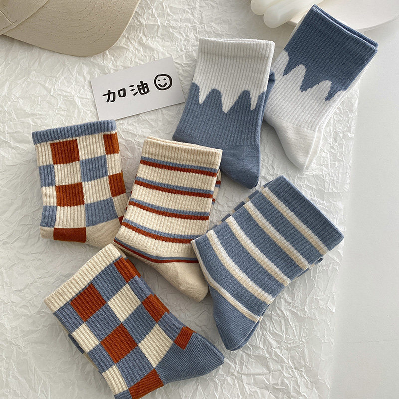 Socks women's middle tube socks ins tide spring and autumn cute Japanese wild striped plaid Korean version college style cotton stockings