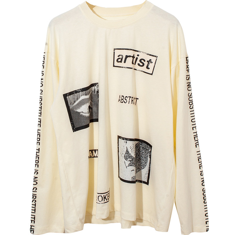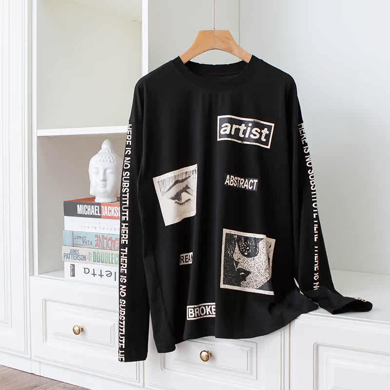 Street fashion clip printing Loose straight body retro silhouette round neck long sleeves delicate thin cotton T-shirt women q