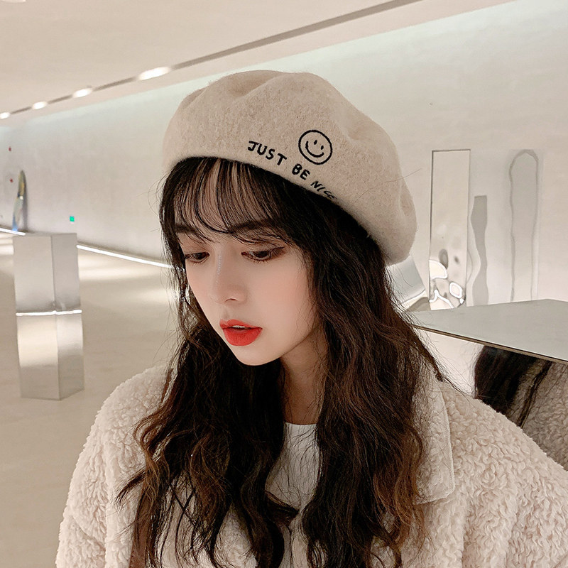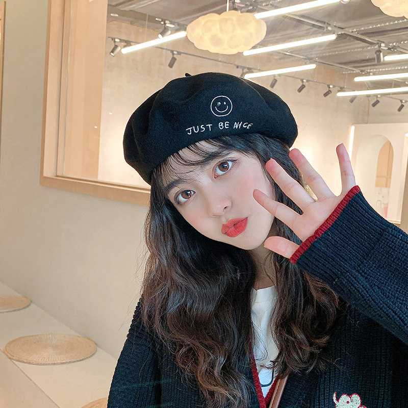 Beret Hat Autumn Winter Smilkface Letter Embroidered Wool Painter Hat Lady Hat Day Warm Hat Tide