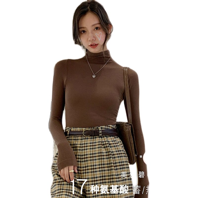 Autumn and winter bottoming shirt women's high-neck Japanese thin section self-heating slim fit warm seamless caramel black s inner top T-shirt