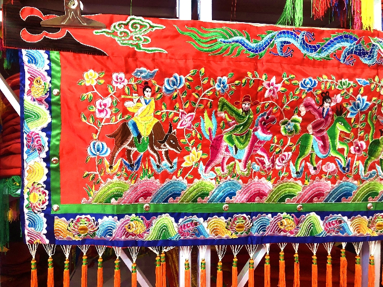 Taiwan version of red satin cloth embroidered with Eight Immortals and colorful eyebrows. Festive banner. Universal temple home use without gold and jade.