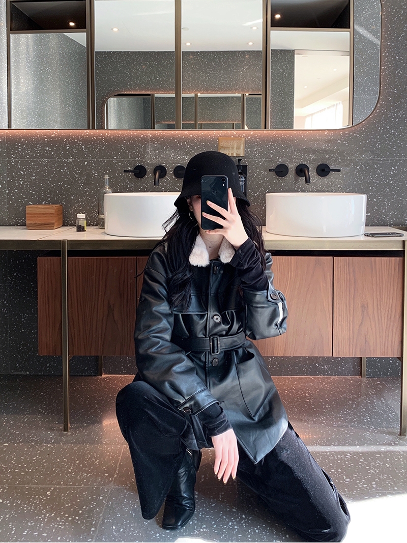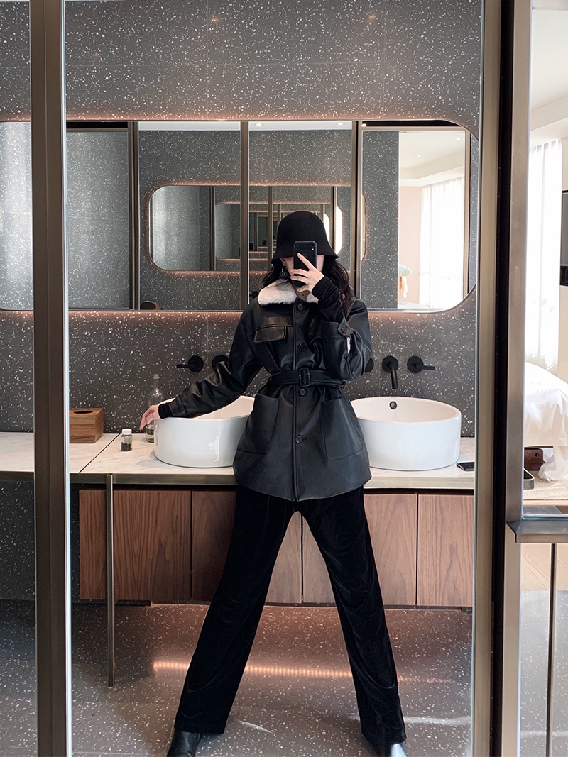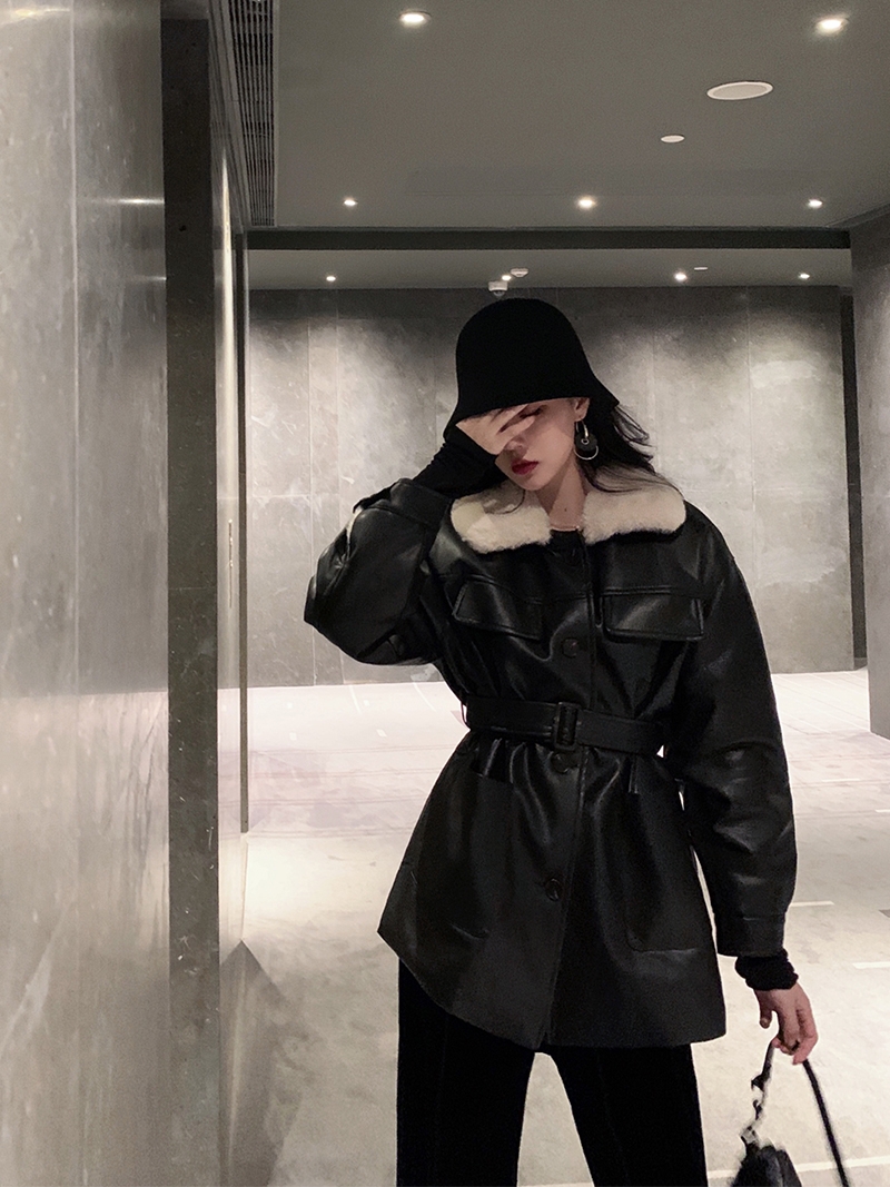 Fur coat women's 2022 winter new style plus velvet waist slimming all-match lapel motorcycle leather jacket trendy