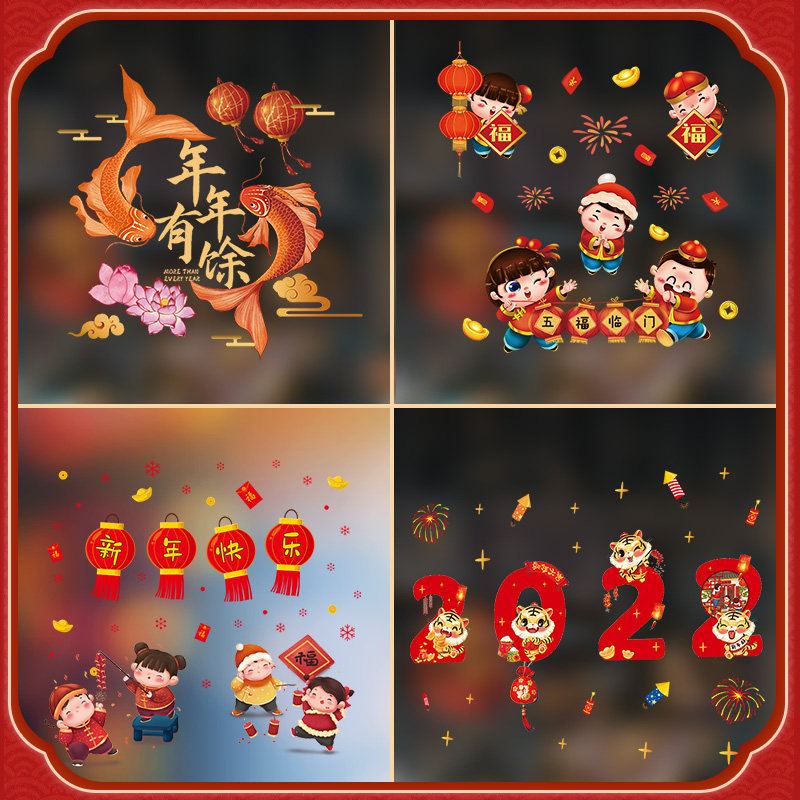 2022 Year of the Tiger New Year decorative glass stickers hotel shopping mall window decorations Spring Festival stickers New Year blessing word layout