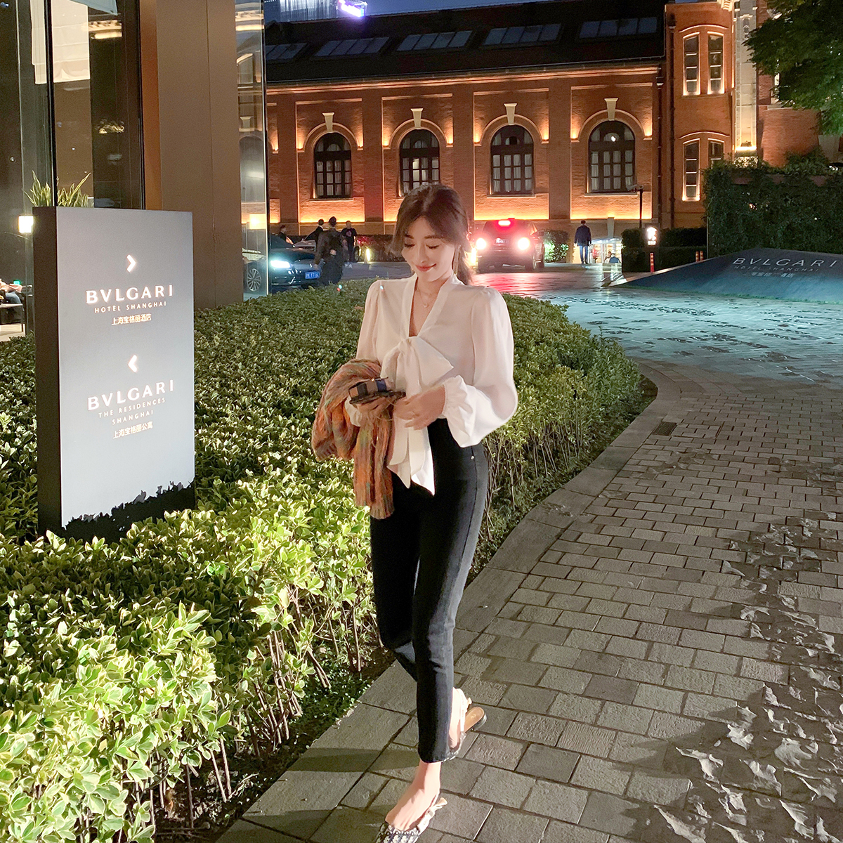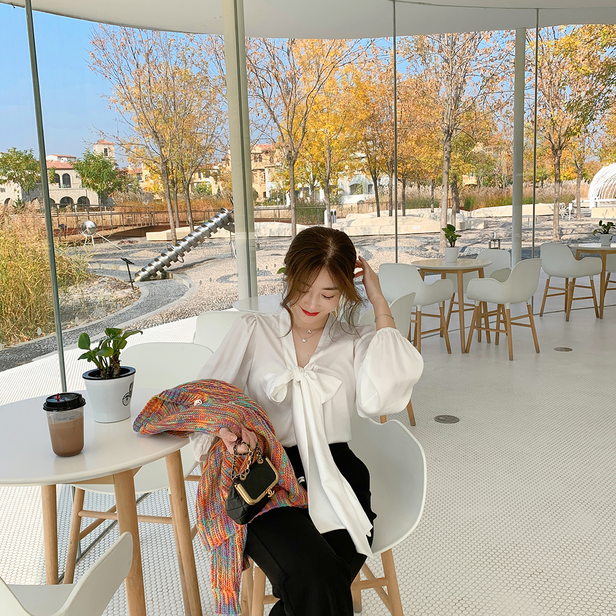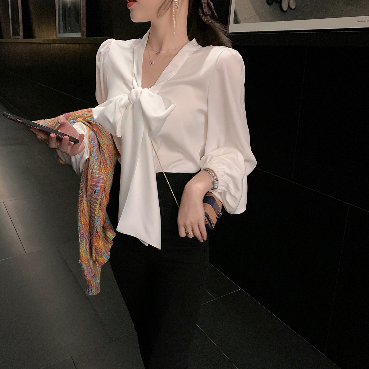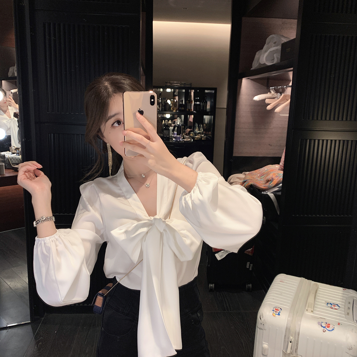 ByYou 2022 Summer white V collar Great butterfly knot shirt female Korean version temperament 100 hitch slim fairy shirt