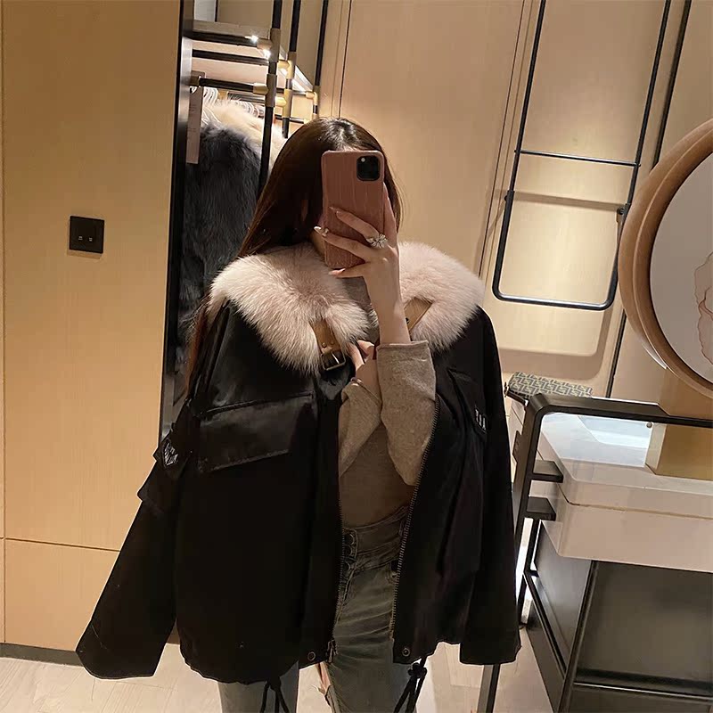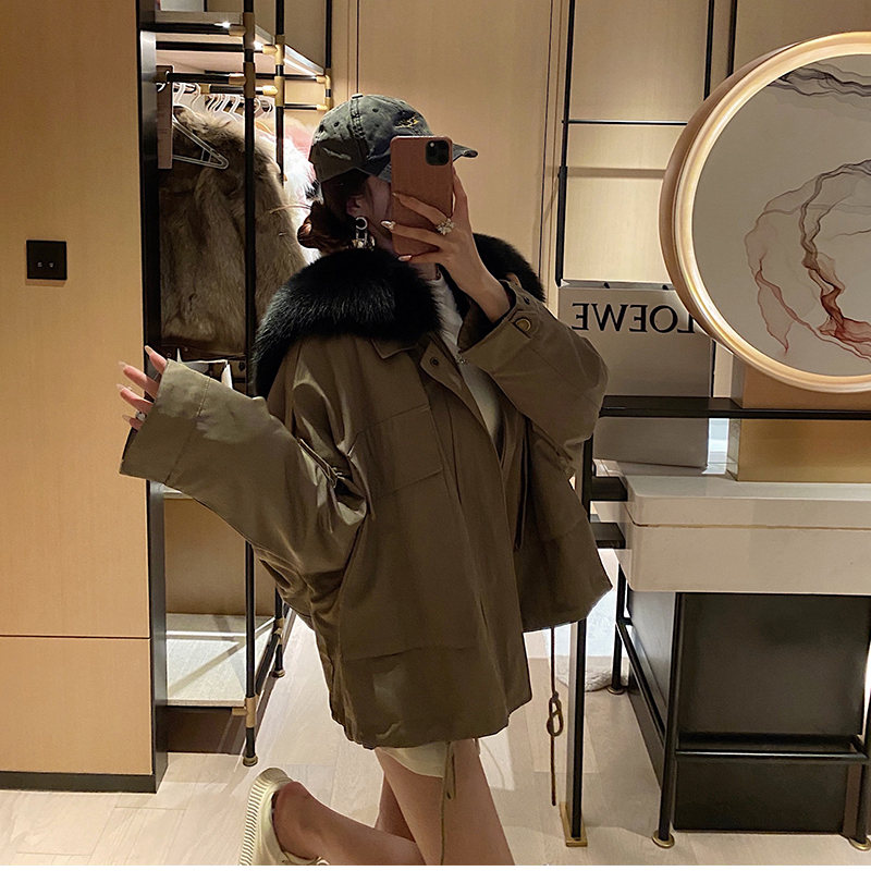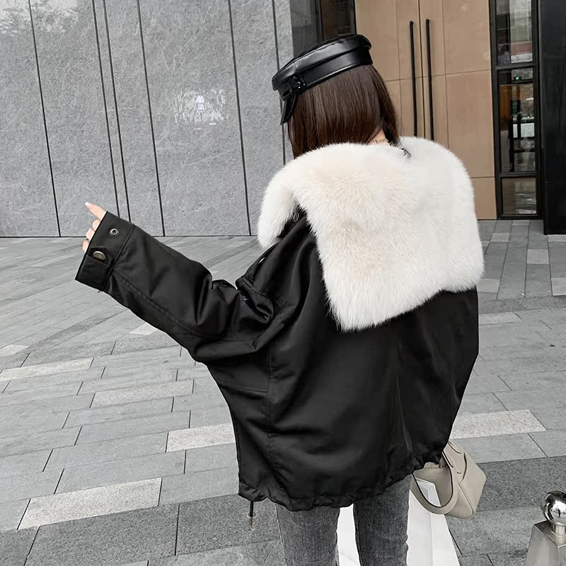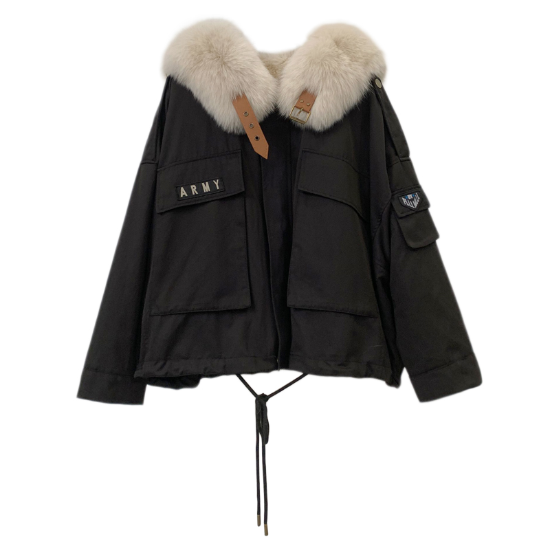 2022 New Fox Fur Women's Overcoat with Removable Rex Rabbit Fur Liner Navy Collar Tooling Coat Jacket