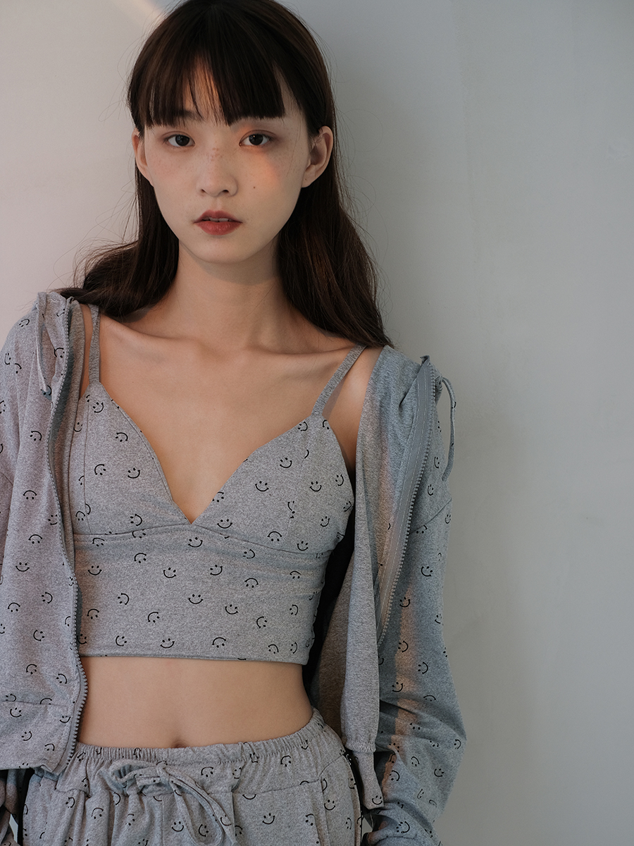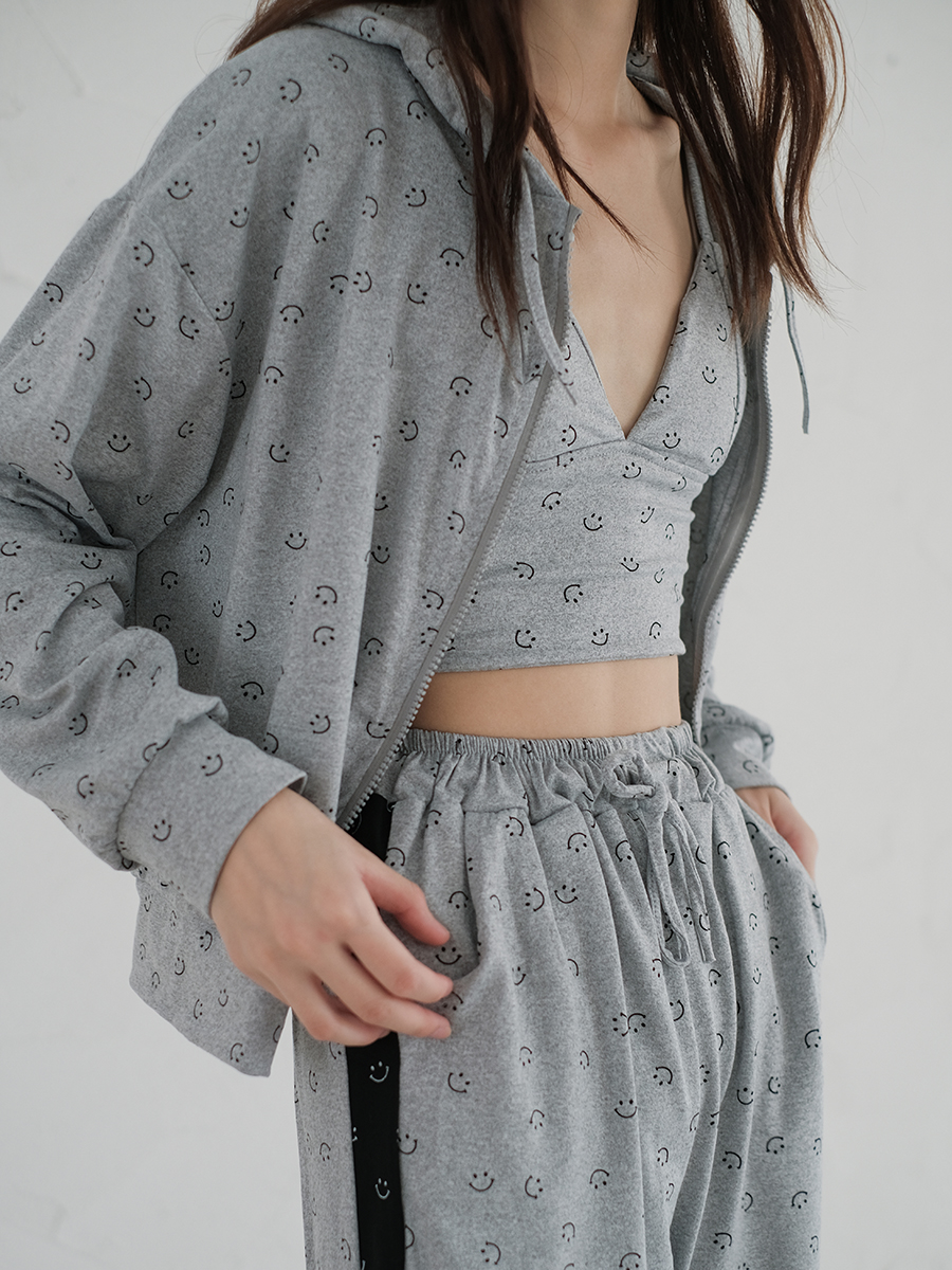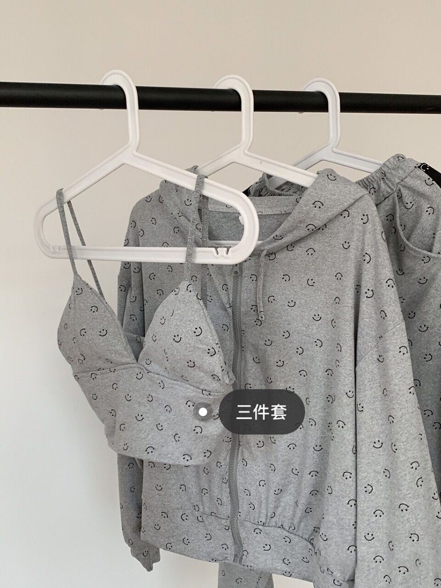 Xinbang help Bra cute smiling face home clothes suspender long pants cardigan three-piece set of pajamas women can wear outside in spring and autumn