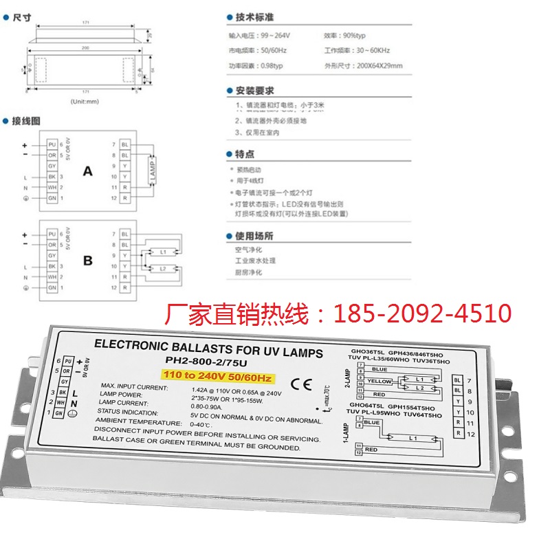 UV Oxygen Light PH2-800-2 75U Ballast Waste Gas Treatment UV Oxygen Accessories 110V Ballast